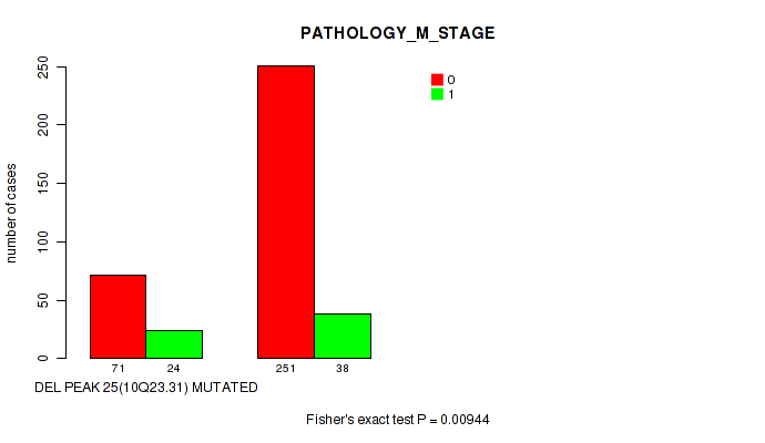 Table S253. Gene #65: 'del_18q21.2' versus Clinical Feature #6: 'PATHOLOGY_M_STAGE'