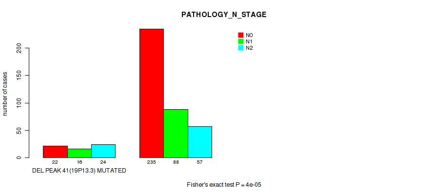 del_19p13.3 cnv correlated to 'NEOPLASM_DISEASESTAGE', 'PATHOLOGY_N_STAGE', 'PATHOLOGY_M_STAGE', and 'NUMBER_OF_LYMPH_NODES'.