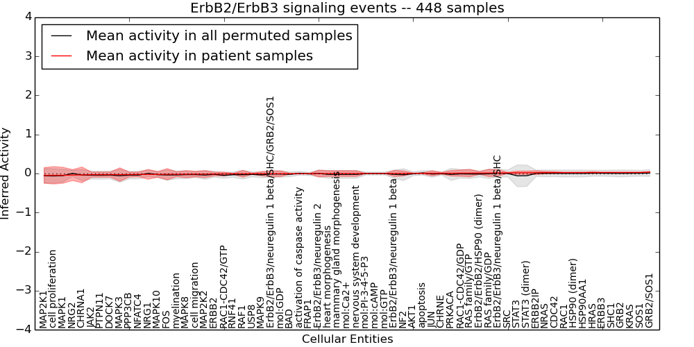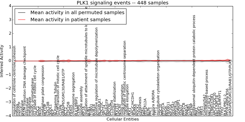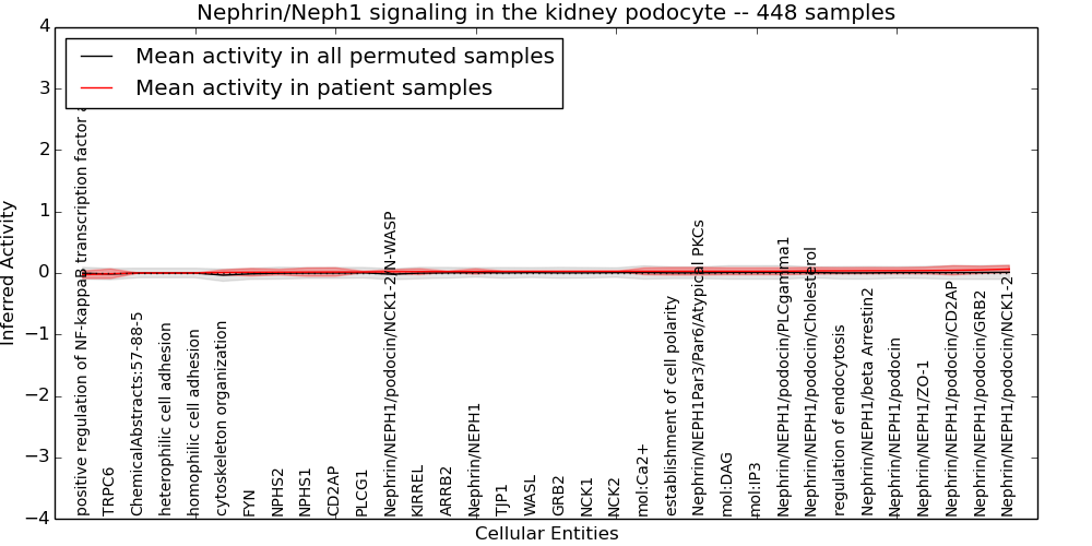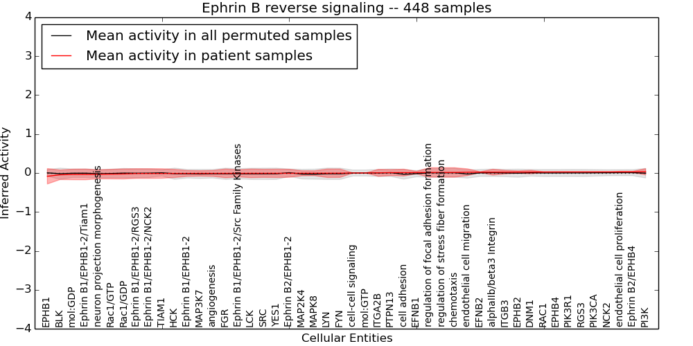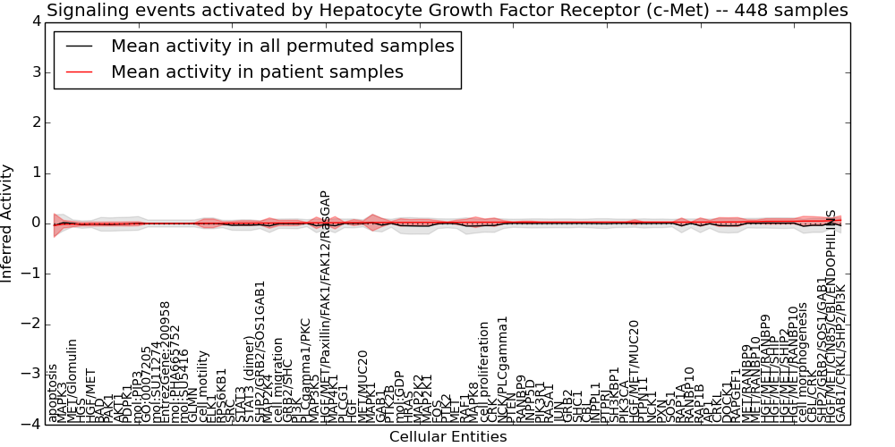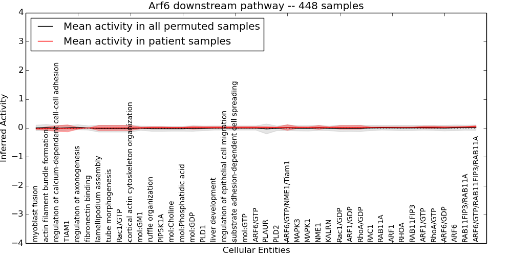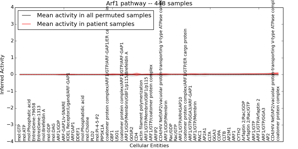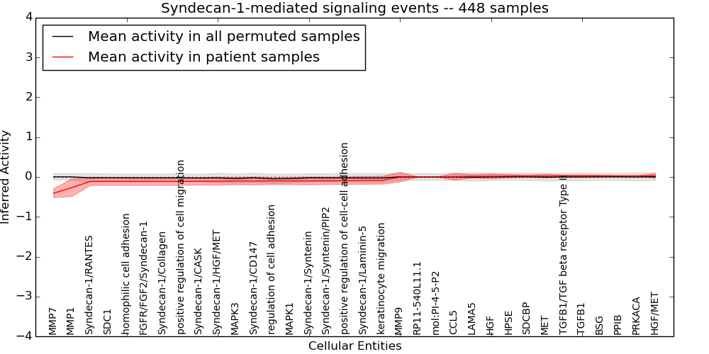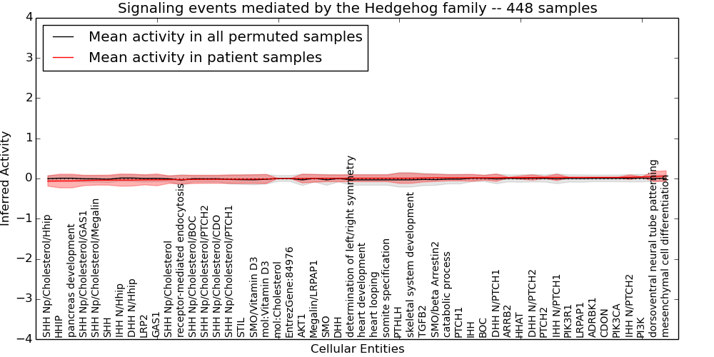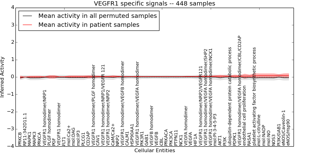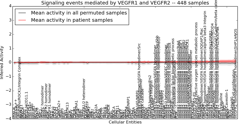 Figure S131. Get High-res Image This plot shows pathway concept perturbations across all samples against a permutation model. The concepts along the x-axis are sorted by lowest to highest mean activity for the real patient samples. Mean inferred activities are plotted along the y-axis as a colored band showing the average level and one standard deviation range. Real samples are shown in red and permuted samples in black.