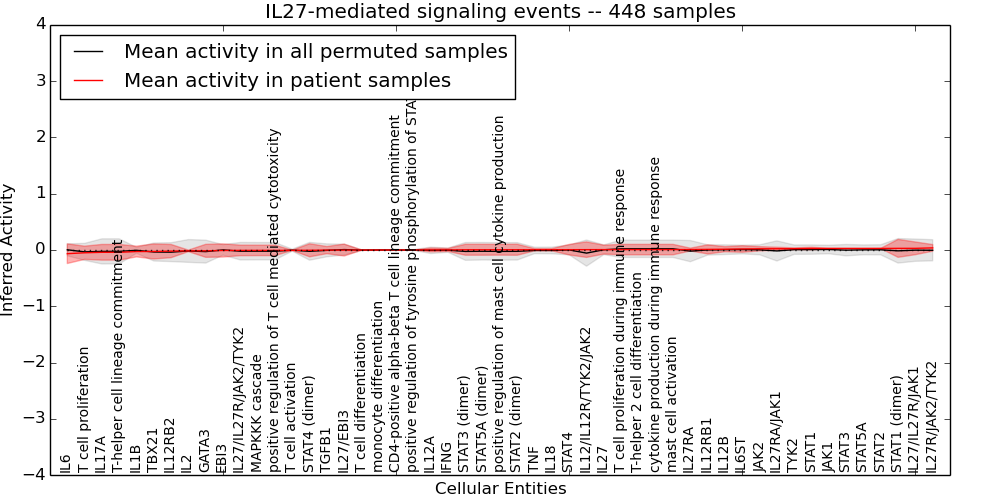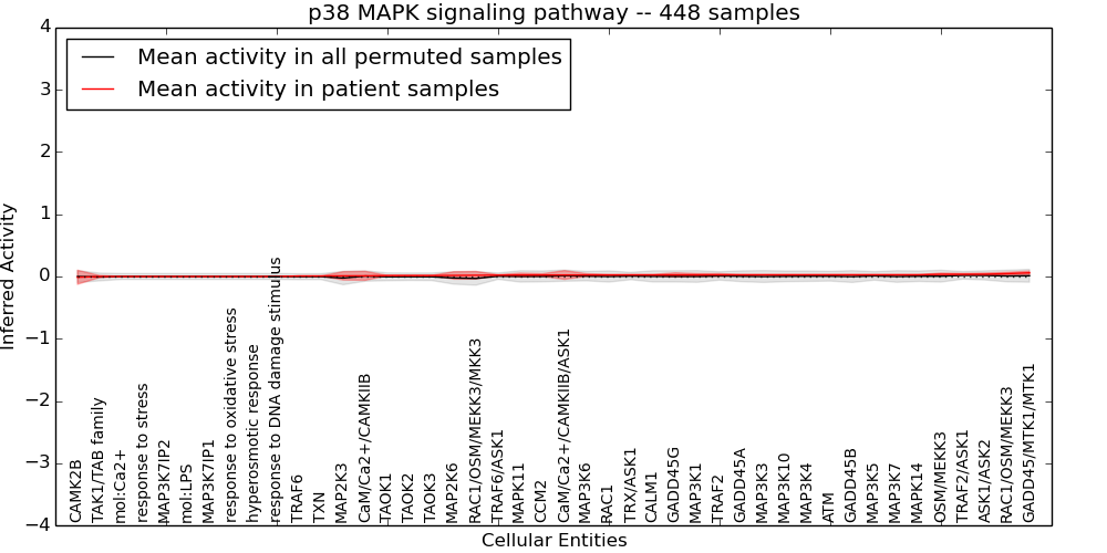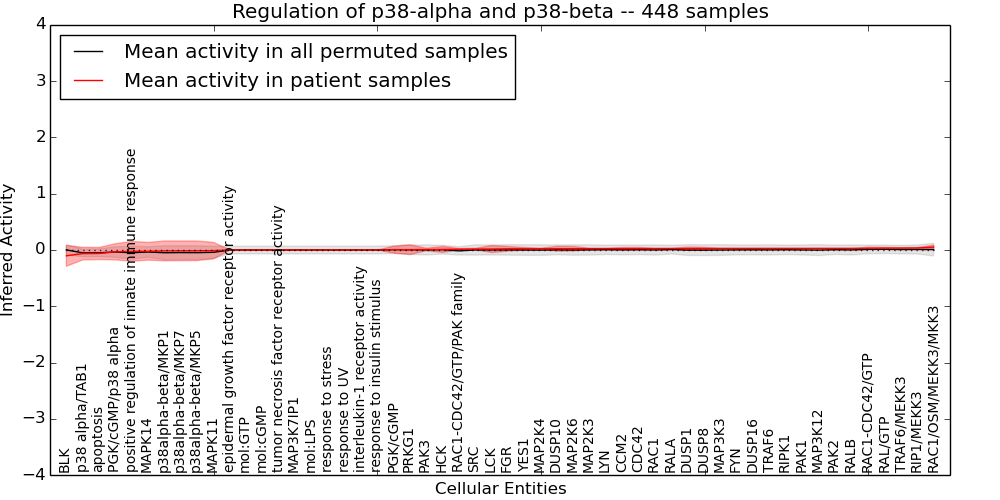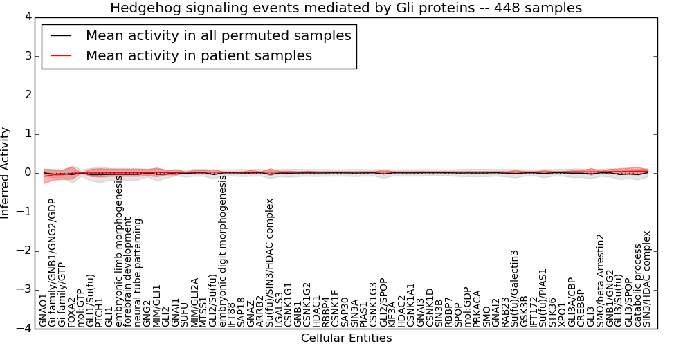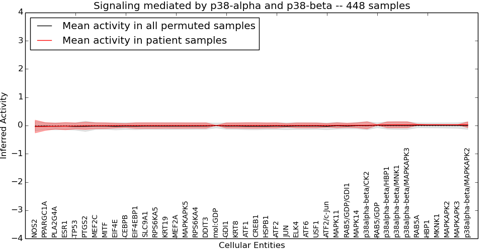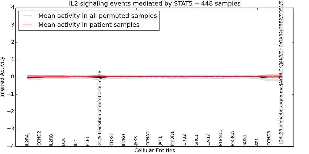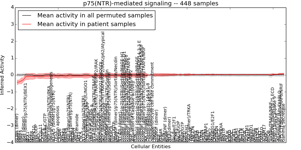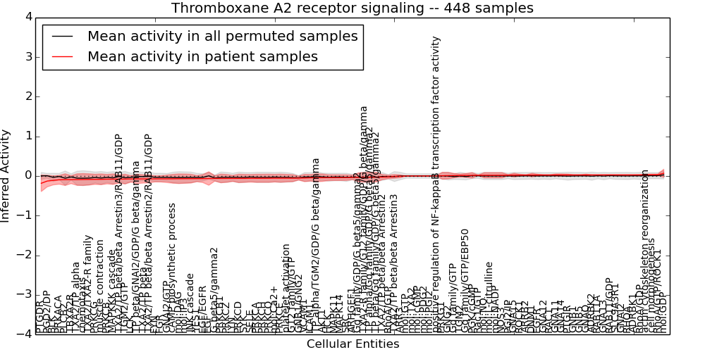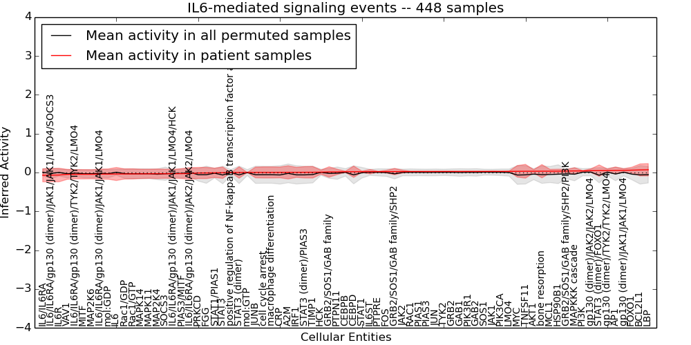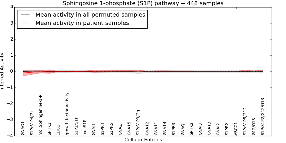 Figure S128. Get High-res Image This plot shows pathway concept perturbations across all samples against a permutation model. The concepts along the x-axis are sorted by lowest to highest mean activity for the real patient samples. Mean inferred activities are plotted along the y-axis as a colored band showing the average level and one standard deviation range. Real samples are shown in red and permuted samples in black.