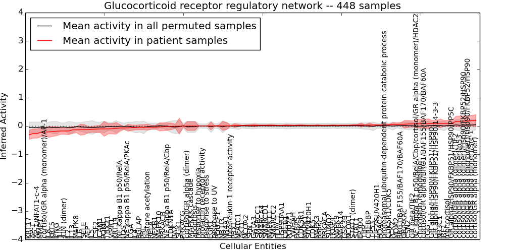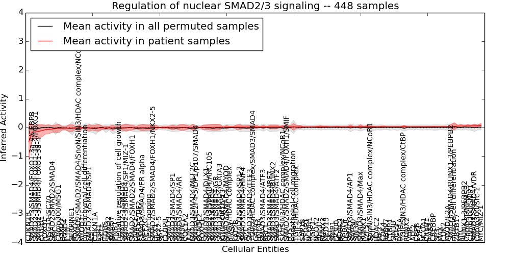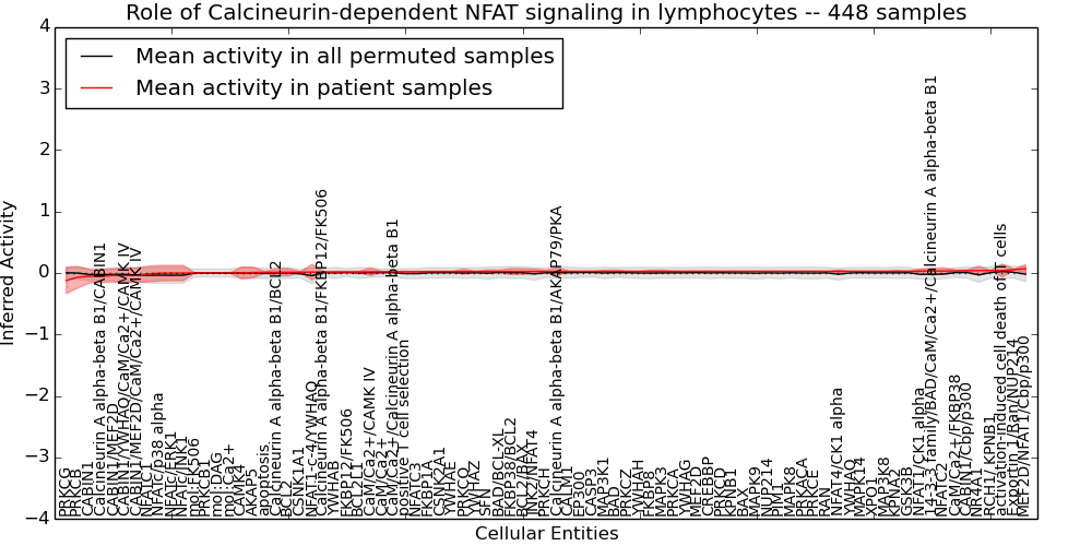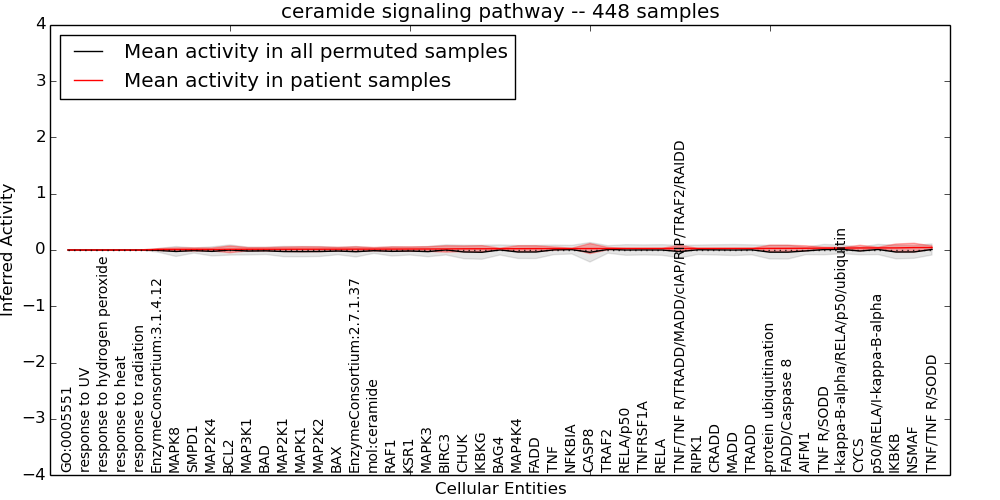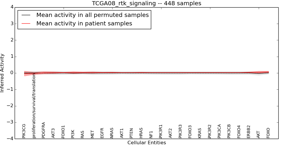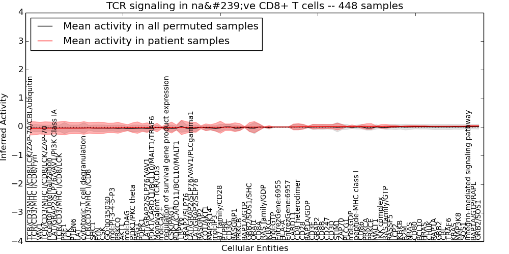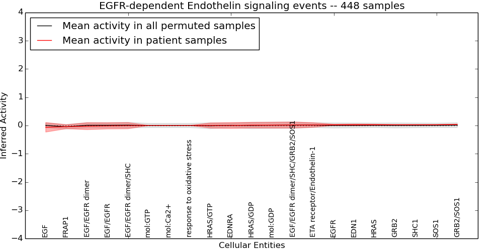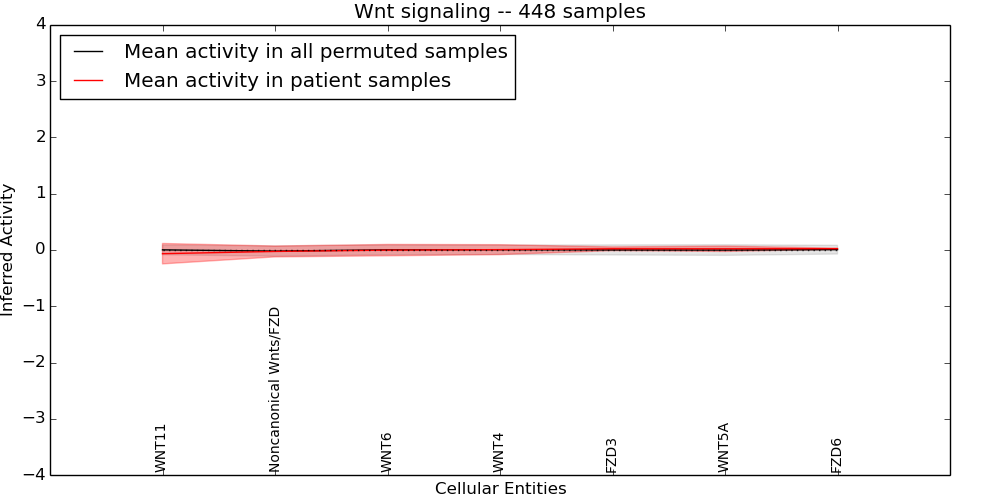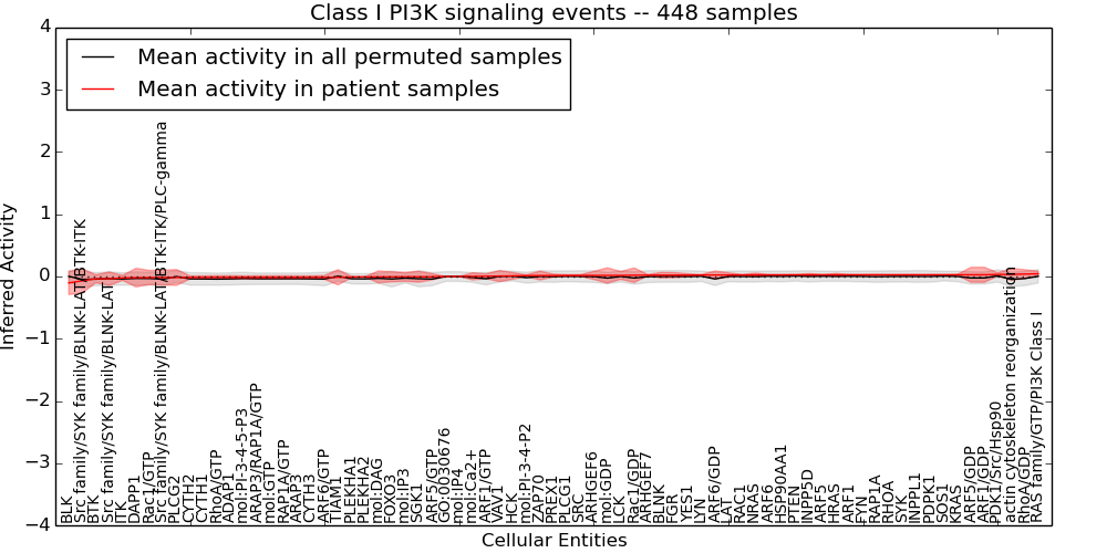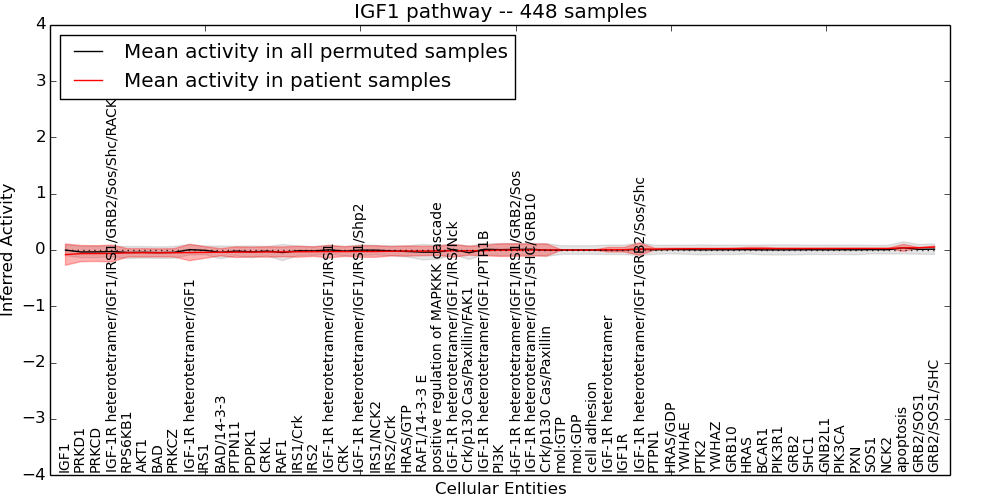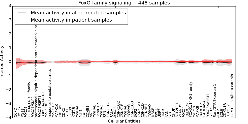 Figure S128. Get High-res Image This plot shows pathway concept perturbations across all samples against a permutation model. The concepts along the x-axis are sorted by lowest to highest mean activity for the real patient samples. Mean inferred activities are plotted along the y-axis as a colored band showing the average level and one standard deviation range. Real samples are shown in red and permuted samples in black.