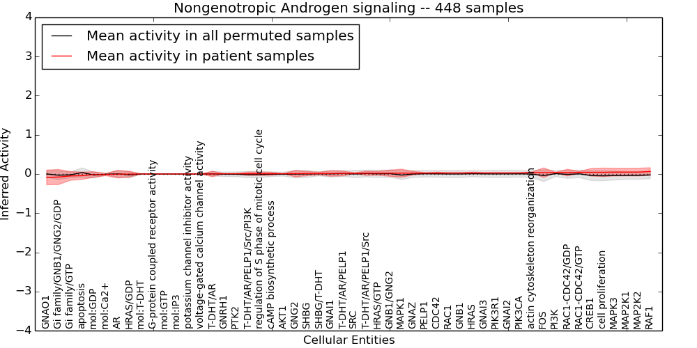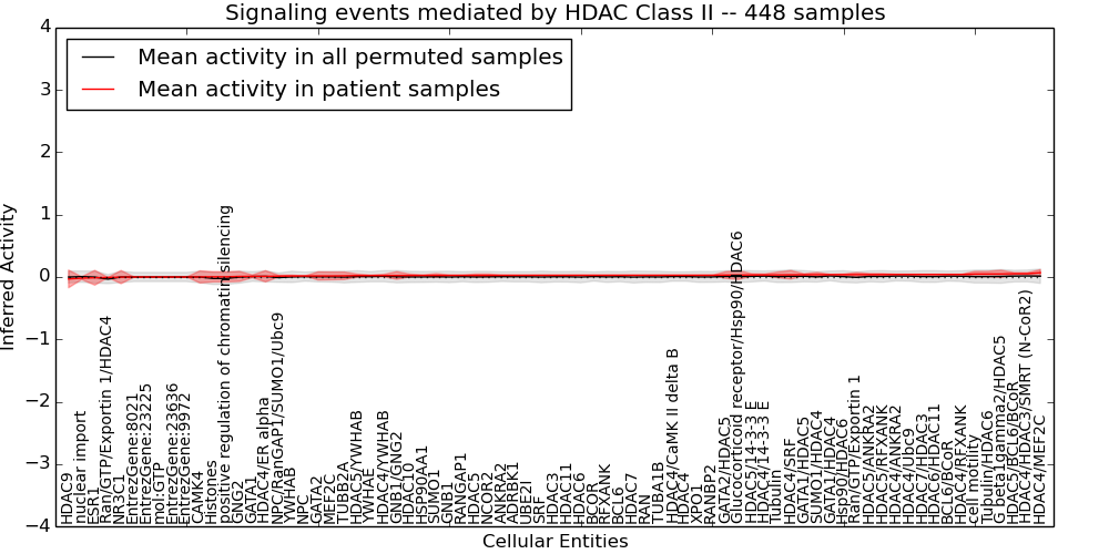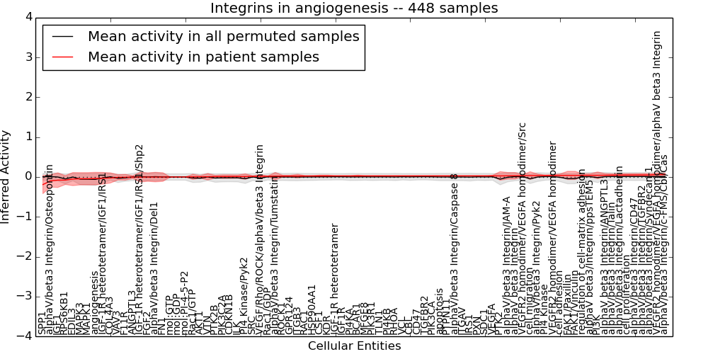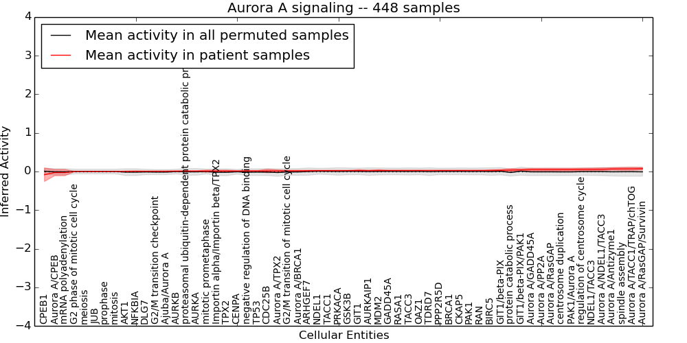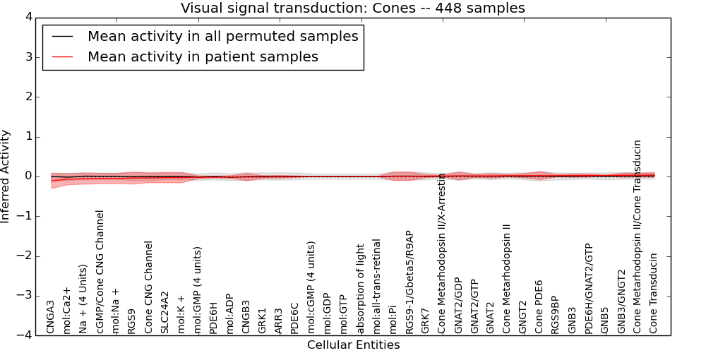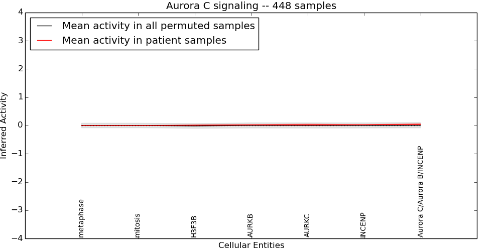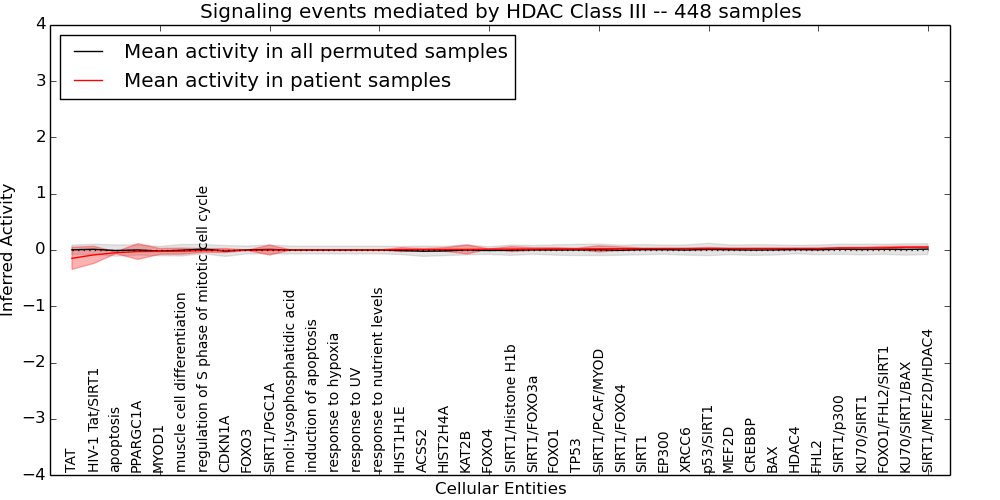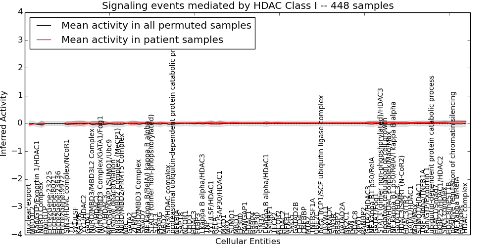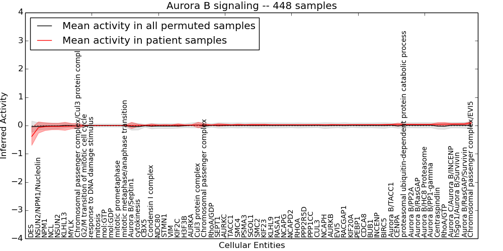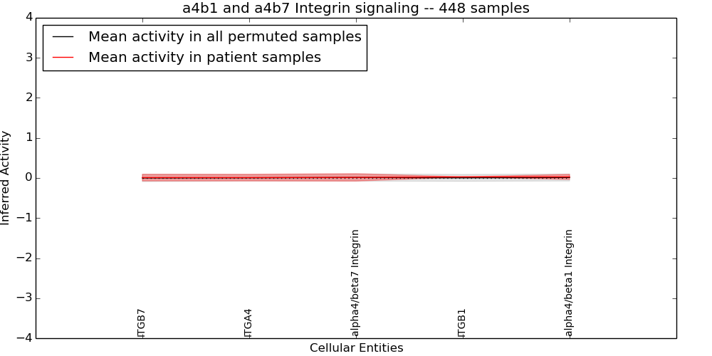Figure S128. Get High-res Image This plot shows pathway concept perturbations across all samples against a permutation model. The concepts along the x-axis are sorted by lowest to highest mean activity for the real patient samples. Mean inferred activities are plotted along the y-axis as a colored band showing the average level and one standard deviation range. Real samples are shown in red and permuted samples in black.