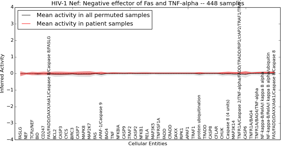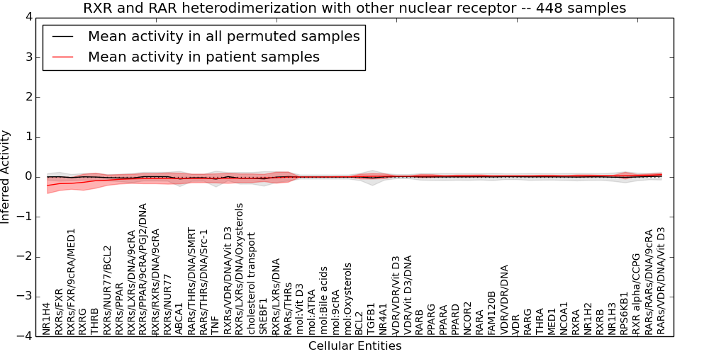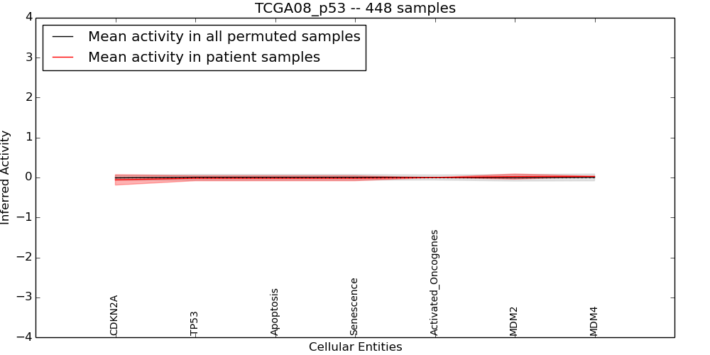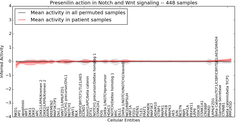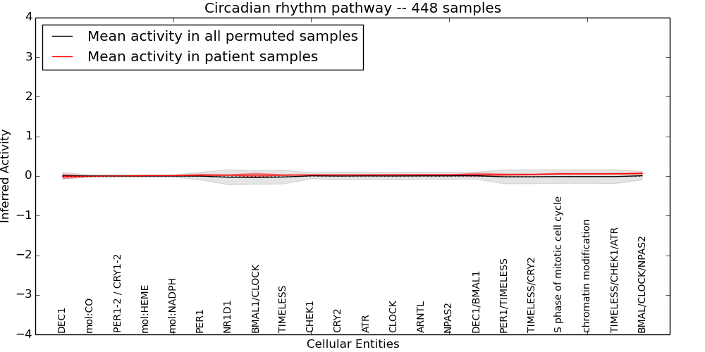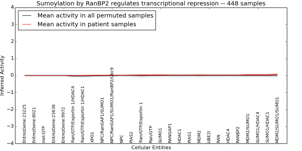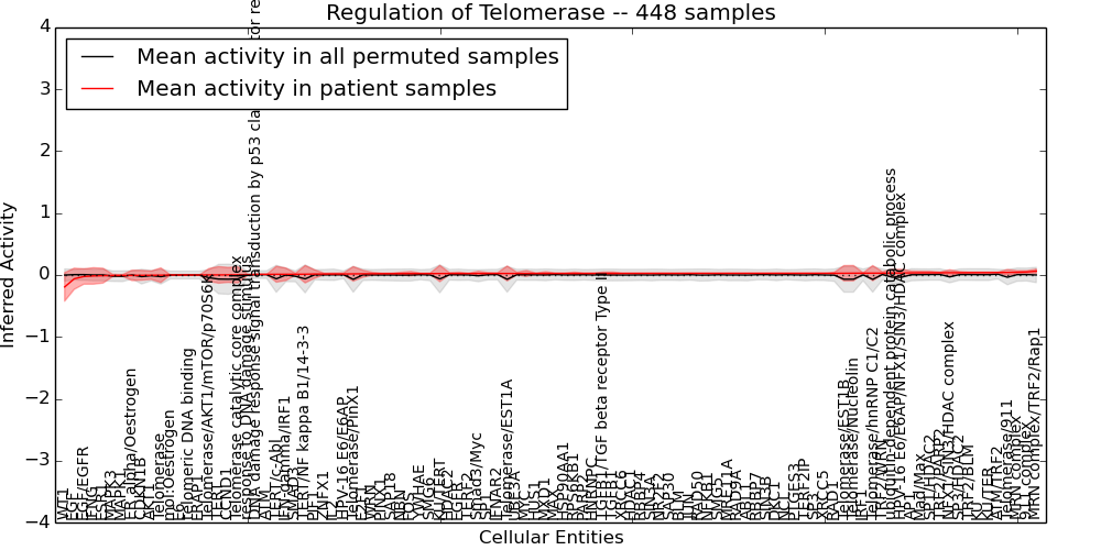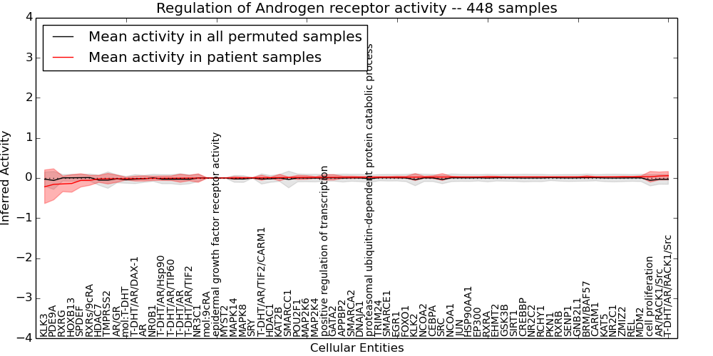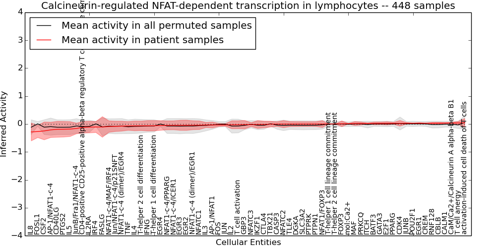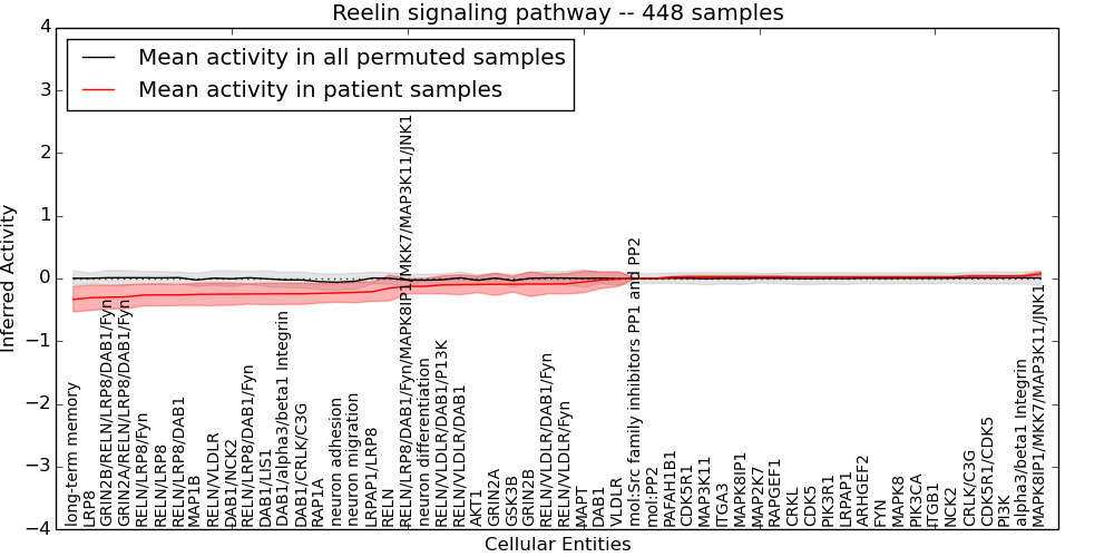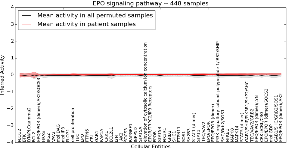Figure S128. Get High-res Image This plot shows pathway concept perturbations across all samples against a permutation model. The concepts along the x-axis are sorted by lowest to highest mean activity for the real patient samples. Mean inferred activities are plotted along the y-axis as a colored band showing the average level and one standard deviation range. Real samples are shown in red and permuted samples in black.