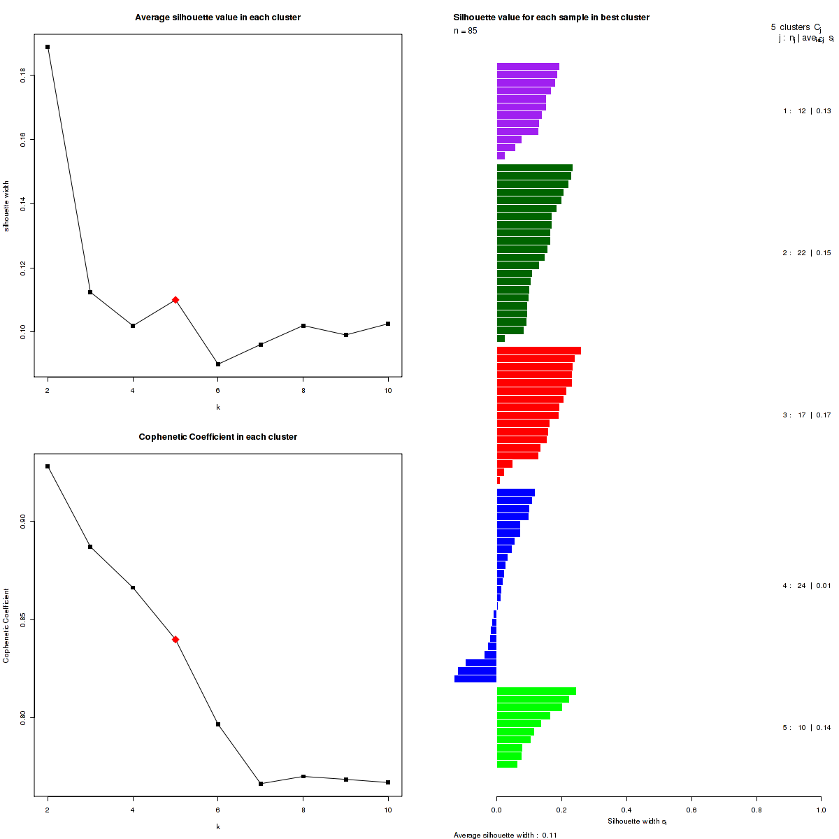 Figure 3. Get High-res Image The silhouette width was calculated for each sample and each value of k. The left upper panel shows the average silhouette width across all samples for each tested k (left upper panel). The left lower panel shows the Cophenetic Correlation Coefficients for each tested k. The right panel shows assignments of clusters to samples and the k silhouette width of each sample for the most robust clustering.