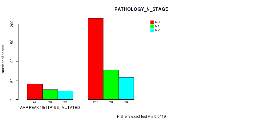 amp_11p15.5 cnv correlated to 'YEARS_TO_BIRTH', 'PATHOLOGY_N_STAGE', 'HISTOLOGICAL_TYPE', and 'NUMBER_OF_LYMPH_NODES'.