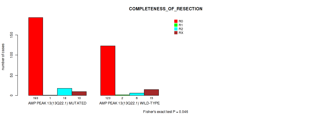 amp_13q22.1 cnv correlated to 'NEOPLASM_DISEASESTAGE', 'PATHOLOGY_N_STAGE', 'PATHOLOGY_M_STAGE', 'HISTOLOGICAL_TYPE', 'COMPLETENESS_OF_RESECTION', and 'NUMBER_OF_LYMPH_NODES'.