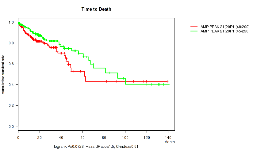 amp_20p12.1 cnv correlated to 'Time to Death', 'NEOPLASM_DISEASESTAGE', 'PATHOLOGY_M_STAGE', 'HISTOLOGICAL_TYPE', and 'COMPLETENESS_OF_RESECTION'.