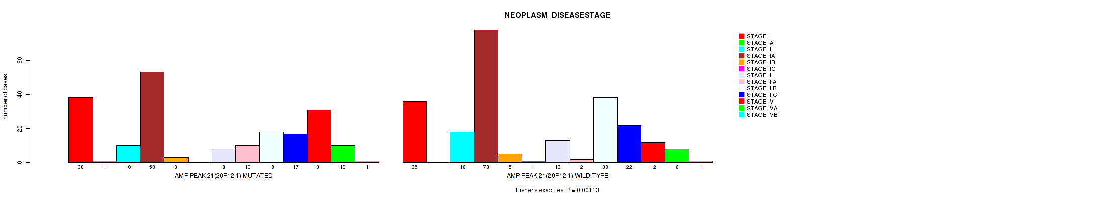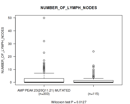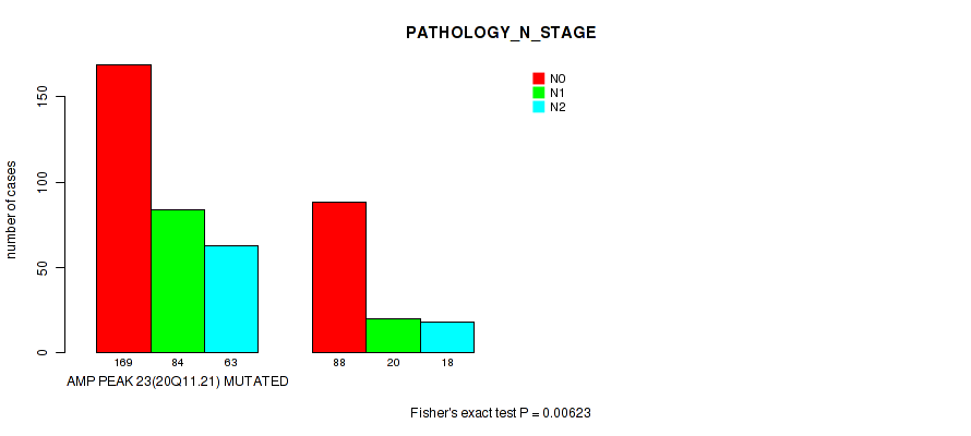 amp_20q11.21 cnv correlated to 'NEOPLASM_DISEASESTAGE', 'PATHOLOGY_N_STAGE', 'PATHOLOGY_M_STAGE', 'HISTOLOGICAL_TYPE', and 'NUMBER_OF_LYMPH_NODES'.
