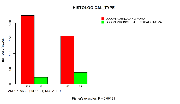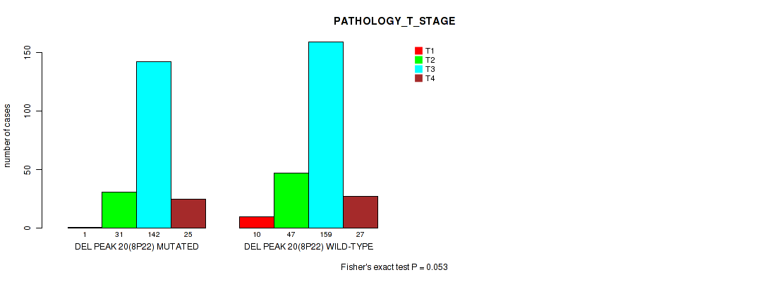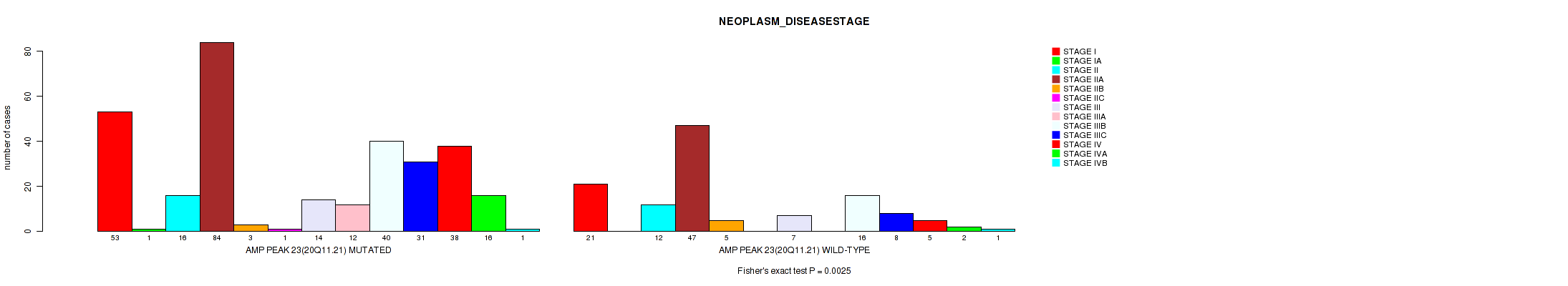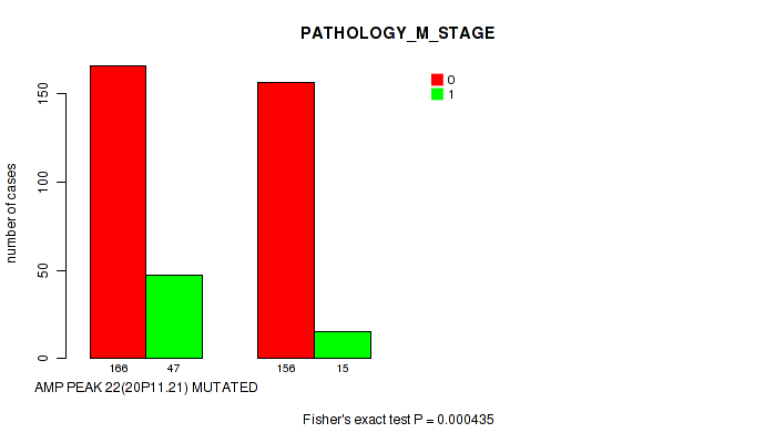 amp_20p11.21 cnv correlated to 'NEOPLASM_DISEASESTAGE', 'PATHOLOGY_M_STAGE', 'HISTOLOGICAL_TYPE', and 'COMPLETENESS_OF_RESECTION'.