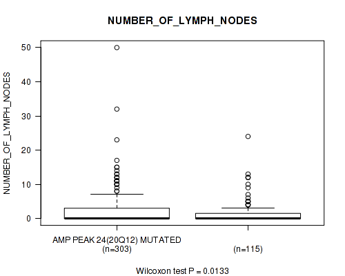 amp_20q12 cnv correlated to 'NEOPLASM_DISEASESTAGE', 'PATHOLOGY_N_STAGE', 'PATHOLOGY_M_STAGE', 'HISTOLOGICAL_TYPE', and 'NUMBER_OF_LYMPH_NODES'.