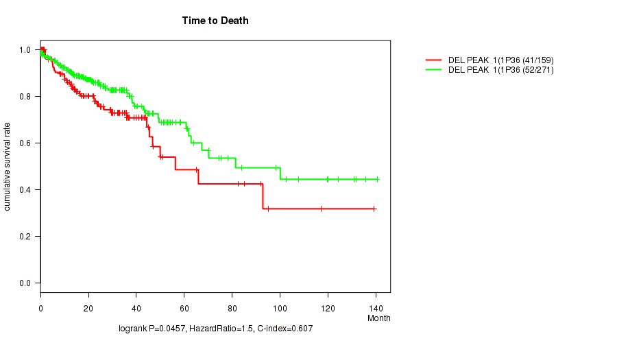 del_1p36.11 cnv correlated to 'Time to Death', 'YEARS_TO_BIRTH', 'NEOPLASM_DISEASESTAGE', 'PATHOLOGY_N_STAGE', 'PATHOLOGY_M_STAGE', 'HISTOLOGICAL_TYPE', 'NUMBER_OF_LYMPH_NODES', and 'RACE'.