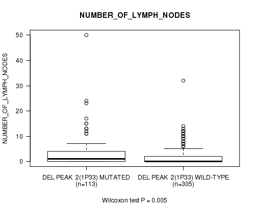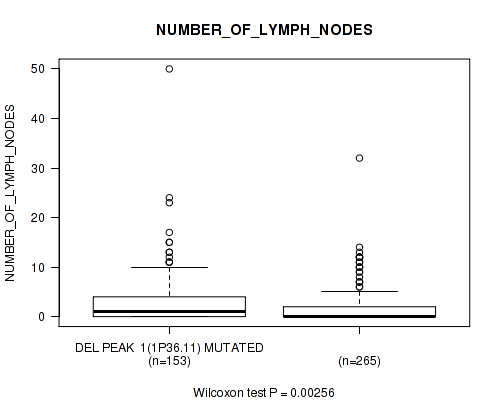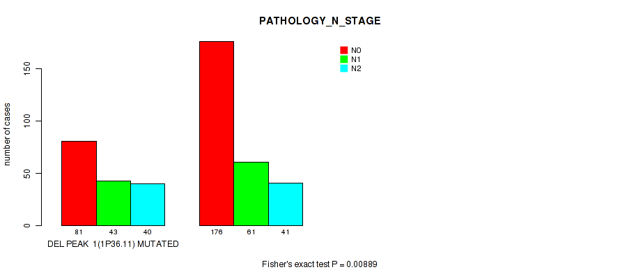 del_1p13.1 cnv correlated to 'NEOPLASM_DISEASESTAGE', 'PATHOLOGY_N_STAGE', 'PATHOLOGY_M_STAGE', and 'NUMBER_OF_LYMPH_NODES'.