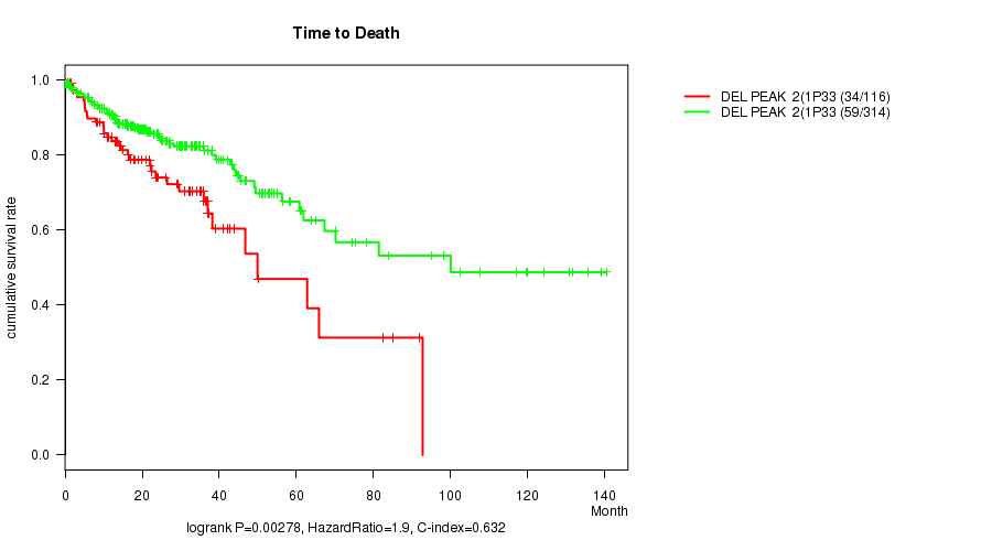 del_1p33 cnv correlated to 'Time to Death', 'NEOPLASM_DISEASESTAGE', 'PATHOLOGY_N_STAGE', 'PATHOLOGY_M_STAGE', 'HISTOLOGICAL_TYPE', and 'NUMBER_OF_LYMPH_NODES'.
