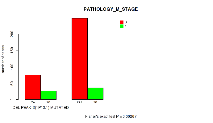 Table S267. Gene #69: 'del_22q13.32' versus Clinical Feature #6: 'PATHOLOGY_M_STAGE'