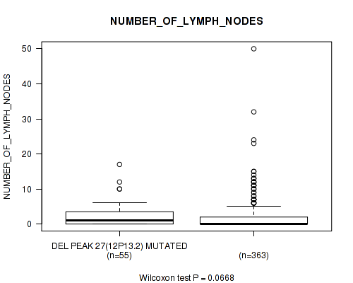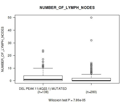 Figure S264. Get High-res Image Gene #68: 'del_21q11.2' versus Clinical Feature #11: 'NUMBER_OF_LYMPH_NODES'