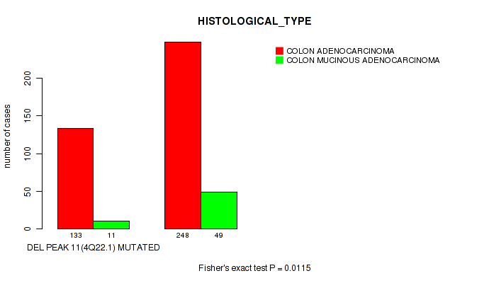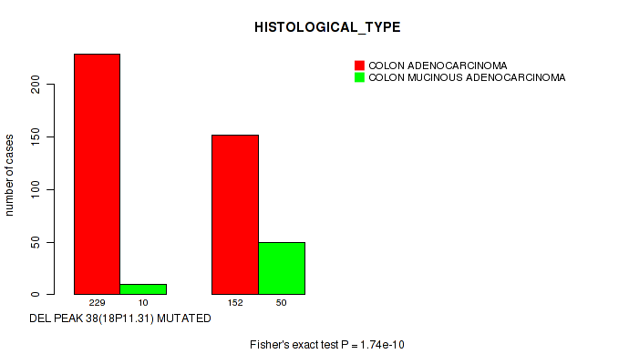 Table S255. Gene #65: 'del_18q21.2' versus Clinical Feature #8: 'HISTOLOGICAL_TYPE'