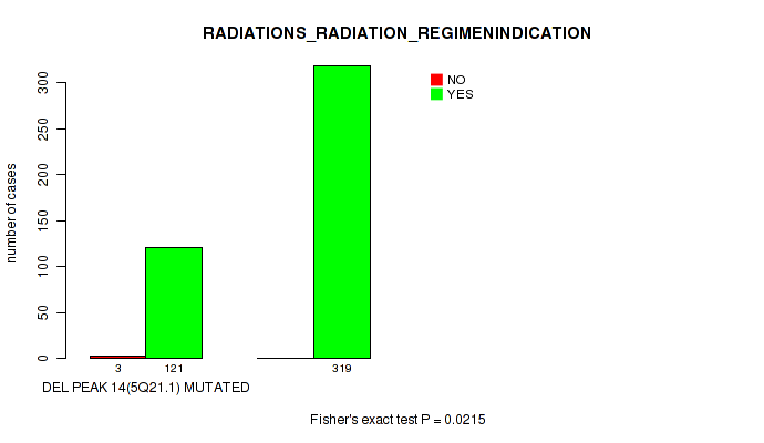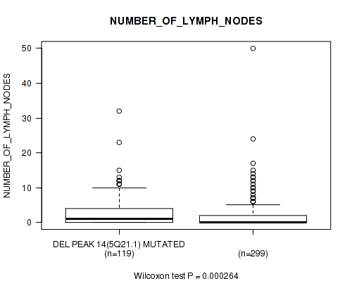 del_5q21.1 cnv correlated to 'NEOPLASM_DISEASESTAGE', 'PATHOLOGY_N_STAGE', 'PATHOLOGY_M_STAGE', 'RADIATIONS_RADIATION_REGIMENINDICATION', and 'NUMBER_OF_LYMPH_NODES'.