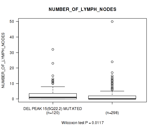 del_5q22.2 cnv correlated to 'NEOPLASM_DISEASESTAGE', 'PATHOLOGY_N_STAGE', 'PATHOLOGY_M_STAGE', 'RADIATIONS_RADIATION_REGIMENINDICATION', and 'NUMBER_OF_LYMPH_NODES'.