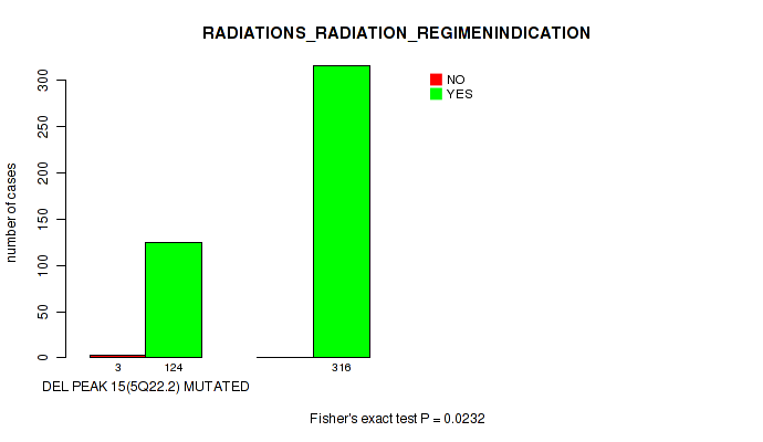 del_15q22.33 cnv correlated to 'NEOPLASM_DISEASESTAGE', 'PATHOLOGY_N_STAGE', 'PATHOLOGY_M_STAGE', 'HISTOLOGICAL_TYPE', 'RADIATIONS_RADIATION_REGIMENINDICATION', and 'NUMBER_OF_LYMPH_NODES'.