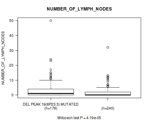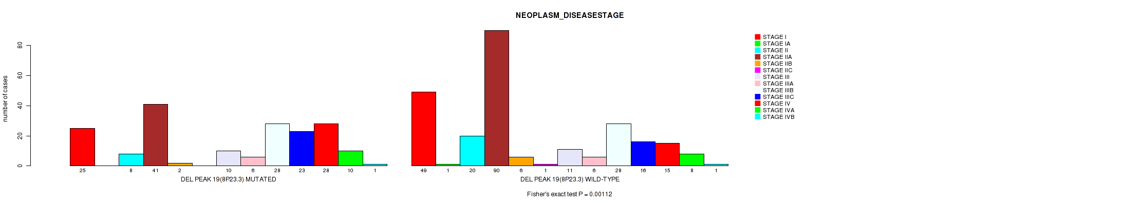 del_19p13.3 cnv correlated to 'NEOPLASM_DISEASESTAGE', 'PATHOLOGY_N_STAGE', 'PATHOLOGY_M_STAGE', and 'NUMBER_OF_LYMPH_NODES'.
