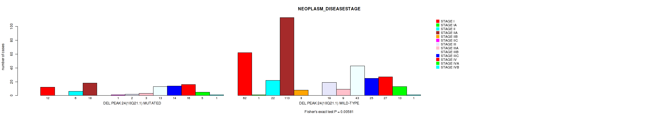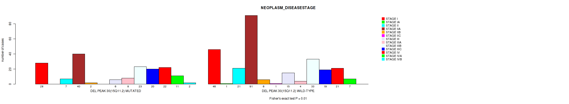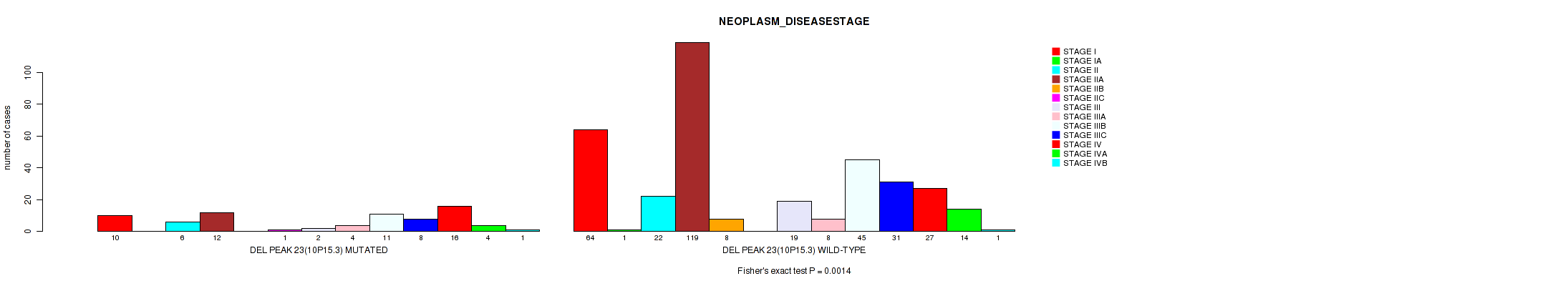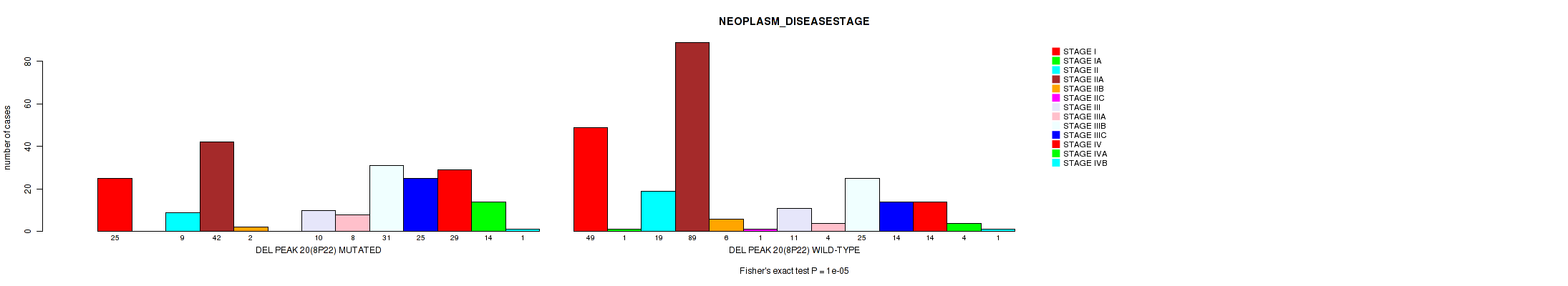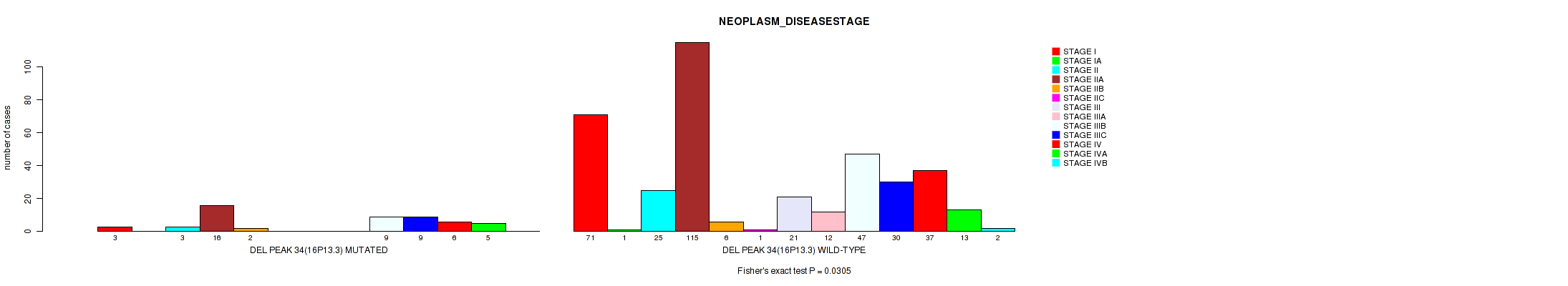 Figure S265. Get High-res Image Gene #69: 'del_22q13.32' versus Clinical Feature #3: 'NEOPLASM_DISEASESTAGE'
