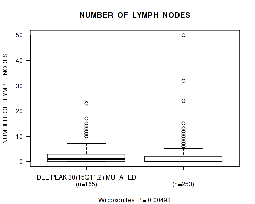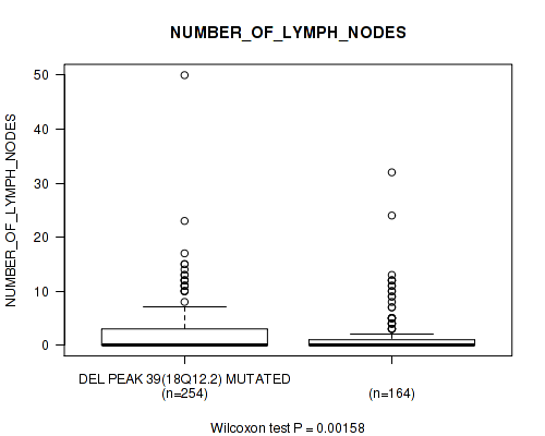 Figure S256. Get High-res Image Gene #65: 'del_18q21.2' versus Clinical Feature #11: 'NUMBER_OF_LYMPH_NODES'