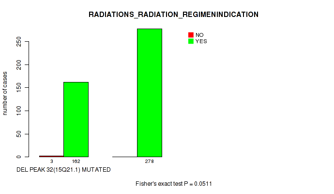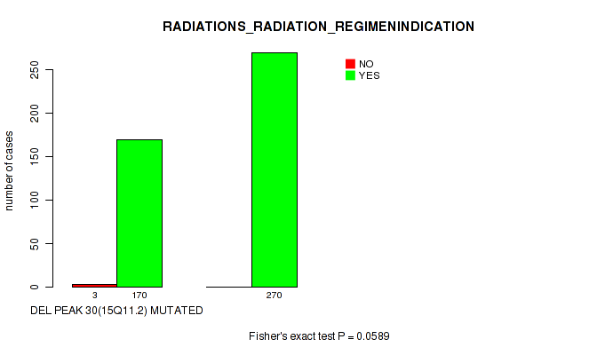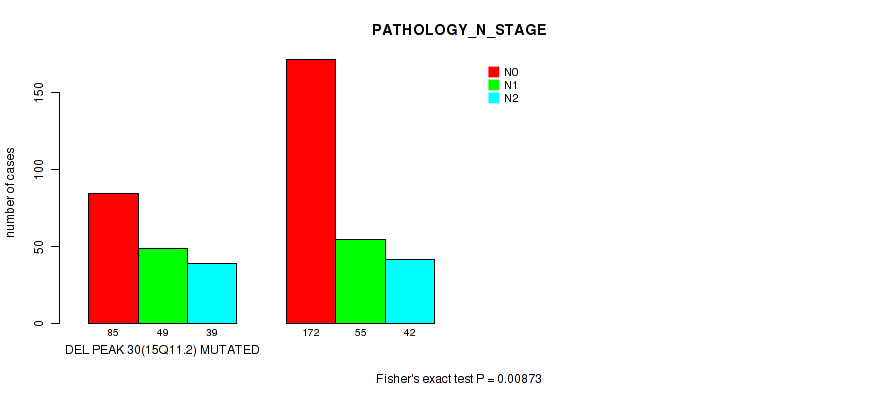 del_15q21.1 cnv correlated to 'NEOPLASM_DISEASESTAGE', 'PATHOLOGY_N_STAGE', 'PATHOLOGY_M_STAGE', 'HISTOLOGICAL_TYPE', 'RADIATIONS_RADIATION_REGIMENINDICATION', and 'NUMBER_OF_LYMPH_NODES'.