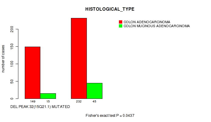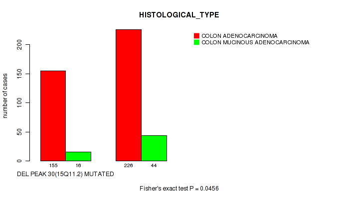 Figure S255. Get High-res Image Gene #65: 'del_18q21.2' versus Clinical Feature #8: 'HISTOLOGICAL_TYPE'