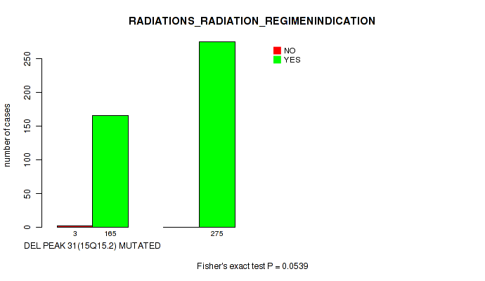 del_15q15.2 cnv correlated to 'NEOPLASM_DISEASESTAGE', 'PATHOLOGY_N_STAGE', 'PATHOLOGY_M_STAGE', 'HISTOLOGICAL_TYPE', 'RADIATIONS_RADIATION_REGIMENINDICATION', and 'NUMBER_OF_LYMPH_NODES'.