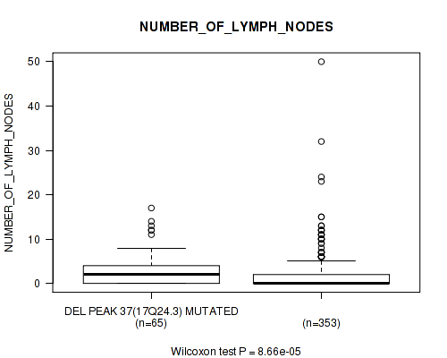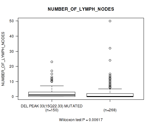 Figure S269. Get High-res Image Gene #69: 'del_22q13.32' versus Clinical Feature #11: 'NUMBER_OF_LYMPH_NODES'