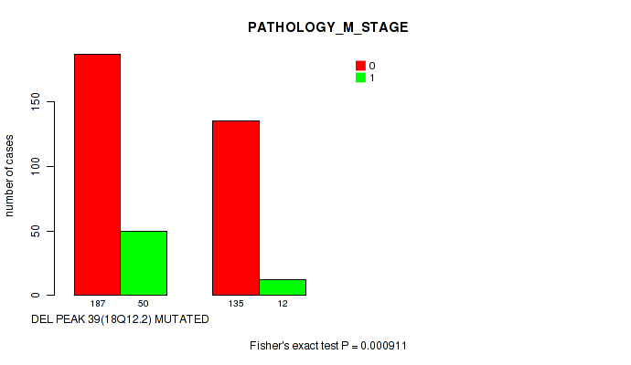 Table S253. Gene #65: 'del_18q21.2' versus Clinical Feature #6: 'PATHOLOGY_M_STAGE'