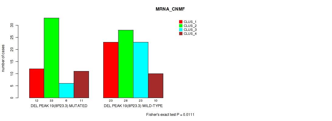 del_19p13.3 cnv correlated to 'CN_CNMF', 'MRNASEQ_CNMF', 'MRNASEQ_CHIERARCHICAL', and 'MIRSEQ_CHIERARCHICAL'.