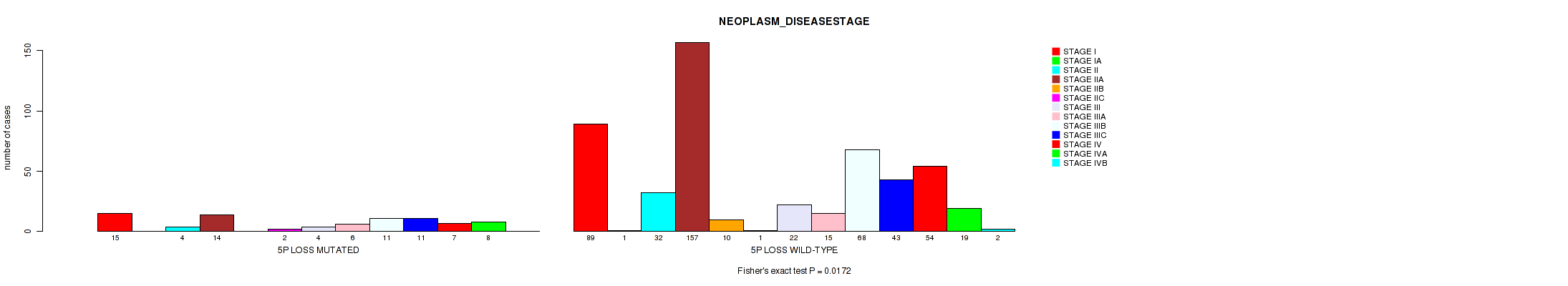 5p loss cnv correlated to 'NEOPLASM_DISEASESTAGE', 'PATHOLOGY_N_STAGE', 'RADIATIONS_RADIATION_REGIMENINDICATION', and 'NUMBER_OF_LYMPH_NODES'.
