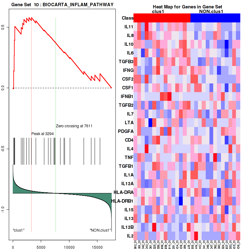 Figure S1.  Get High-res Image This plot shows mRNAseq_cNMF expression data heatmap (on the left) a RunningEnrichmentScore(RES) plot (on the top right) and a Signal2Noise(S2N) plot (on the bottom right) of genes in the pathway: BIOCARTA INFLAM PATHWAY.
