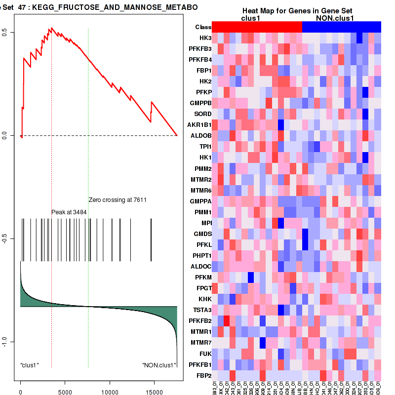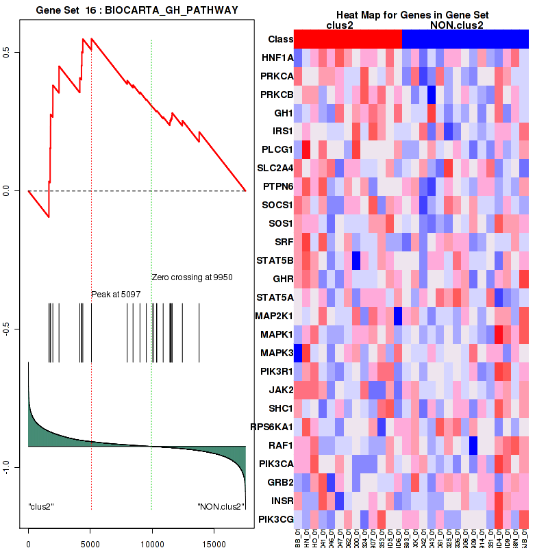 Table S1.  Get Full Table This table shows a Running Enrichment Score (RES) of each gene in this pathway, that is, the enrichment score at this point in the ranked list of genes. All genes are ranked by Signal-to-Noise (S2N), a measure of similarity as default and are used to obtain ES matrix of all genes. In this way, GSEA tool uses expression pattern of not only overlapped genes but also not-overlapped genes to produce ES matrix.