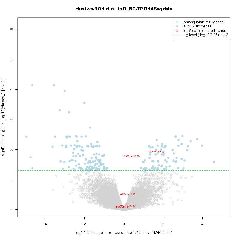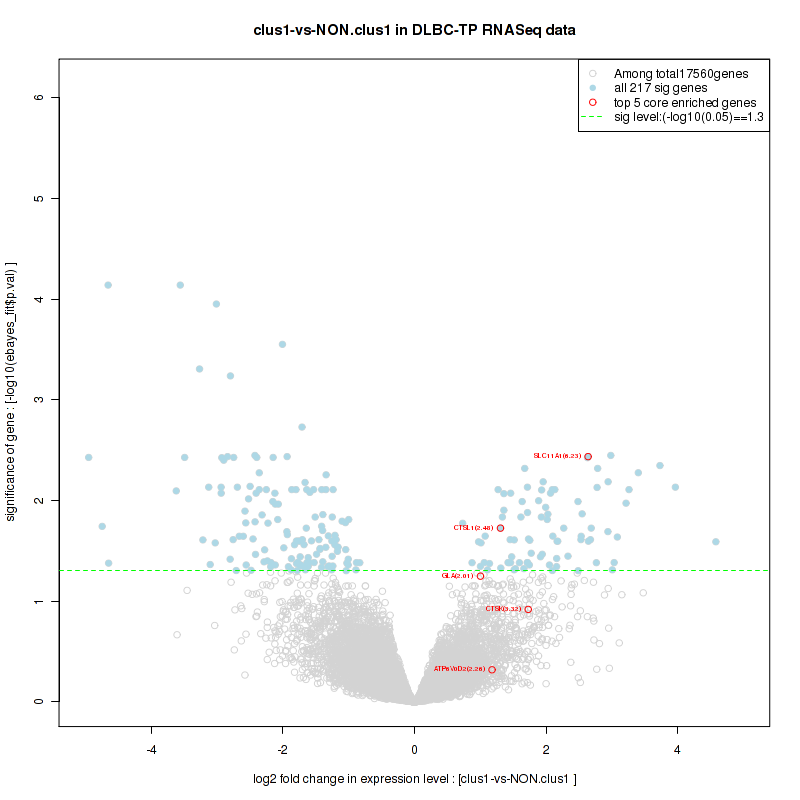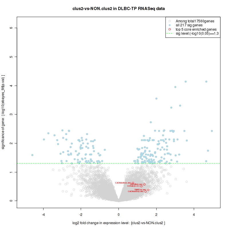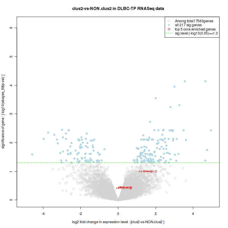 Figure S2.  Get High-res Image For the top 5 core enriched genes in the pathway: BIOCARTA INFLAM PATHWAY, this volcano plot shows how much they are up/down-regulated and significant. The significance was calculated by empirical bayesian fit