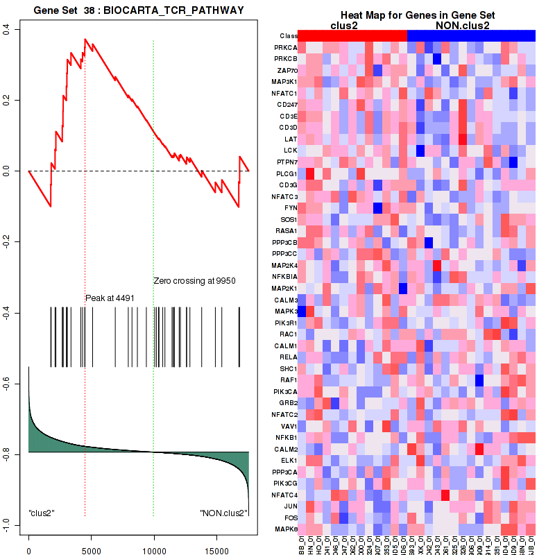 • Top enriched gene sets are BIOCARTA ALK PATHWAY, BIOCARTA CARM ER PATHWAY, BIOCARTA GH PATHWAY, BIOCARTA TCR PATHWAY, KEGG FATTY ACID METABOLISM, KEGG ABC TRANSPORTERS, KEGG CARDIAC MUSCLE CONTRACTION, KEGG WNT SIGNALING PATHWAY, KEGG CELL ADHESION MOLECULES CAMS, KEGG INTESTINAL IMMUNE NETWORK FOR IGA PRODUCTION