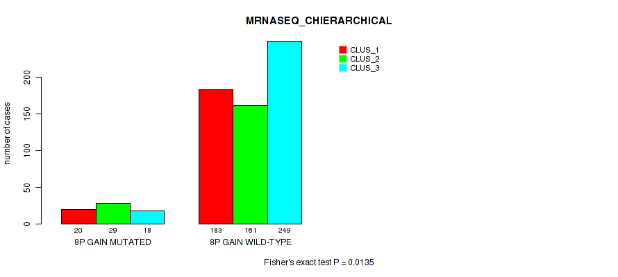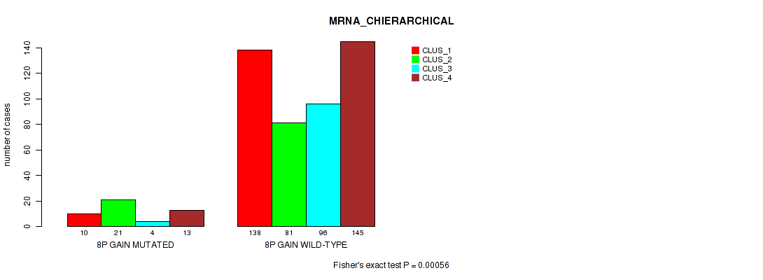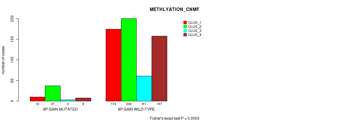 8p gain cnv correlated to 'MRNA_CNMF', 'MRNA_CHIERARCHICAL', 'METHLYATION_CNMF', and 'MRNASEQ_CHIERARCHICAL'.