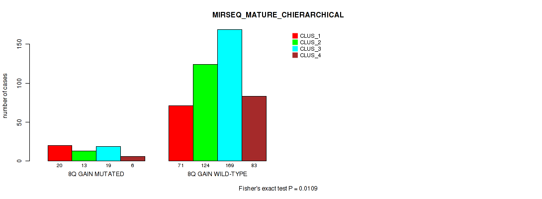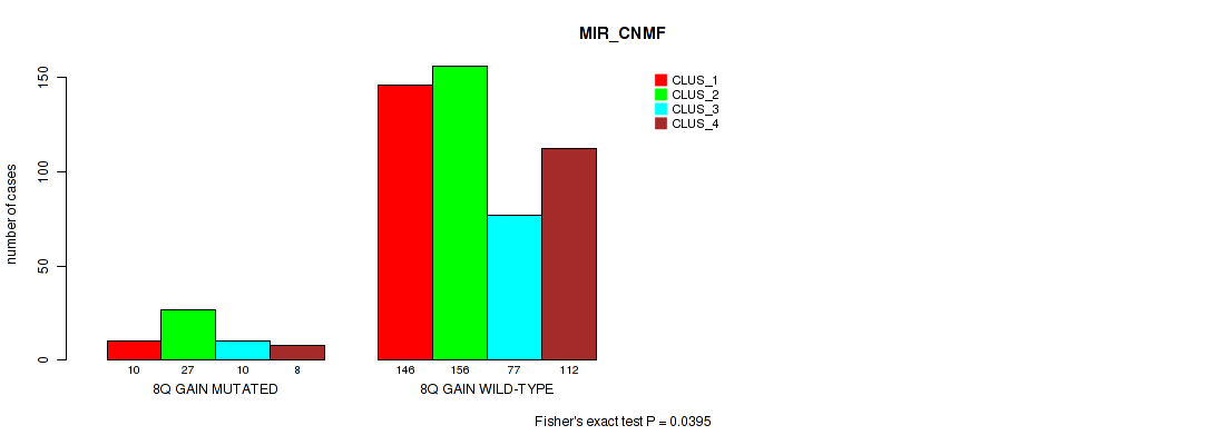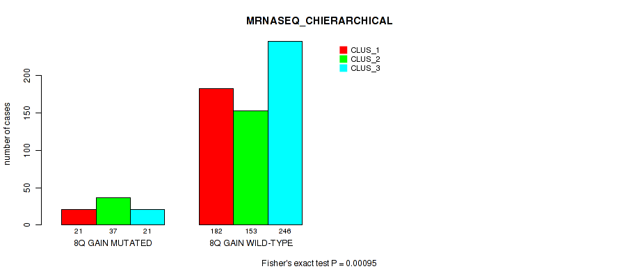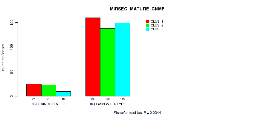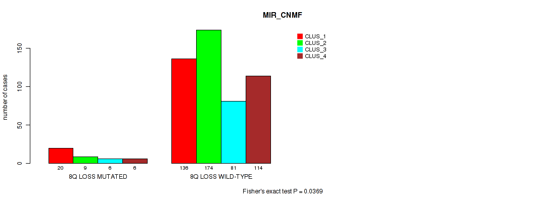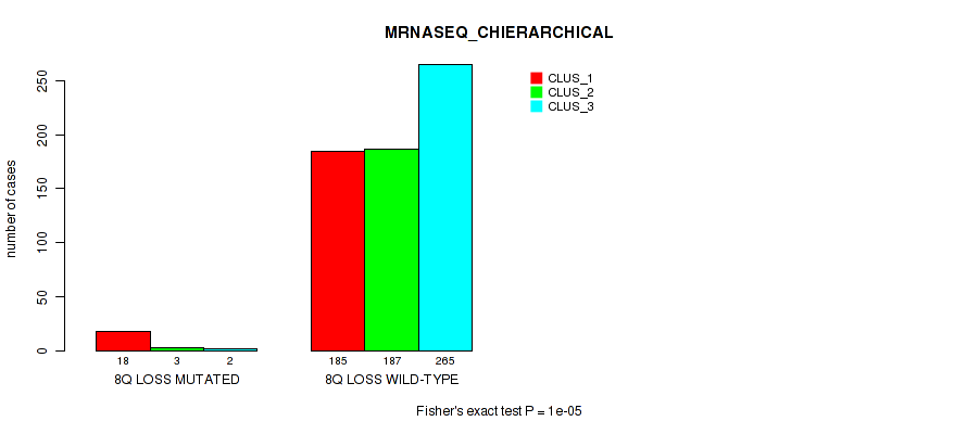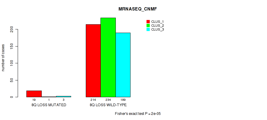 8q loss cnv correlated to 'MIR_CNMF', 'CN_CNMF', 'METHLYATION_CNMF', 'MRNASEQ_CNMF', 'MRNASEQ_CHIERARCHICAL', 'MIRSEQ_CHIERARCHICAL', and 'MIRSEQ_MATURE_CHIERARCHICAL'.