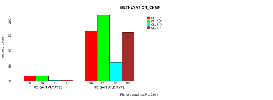 9q gain cnv correlated to 'MRNA_CNMF', 'CN_CNMF', 'METHLYATION_CNMF', 'MRNASEQ_CNMF', 'MRNASEQ_CHIERARCHICAL', and 'MIRSEQ_CHIERARCHICAL'.