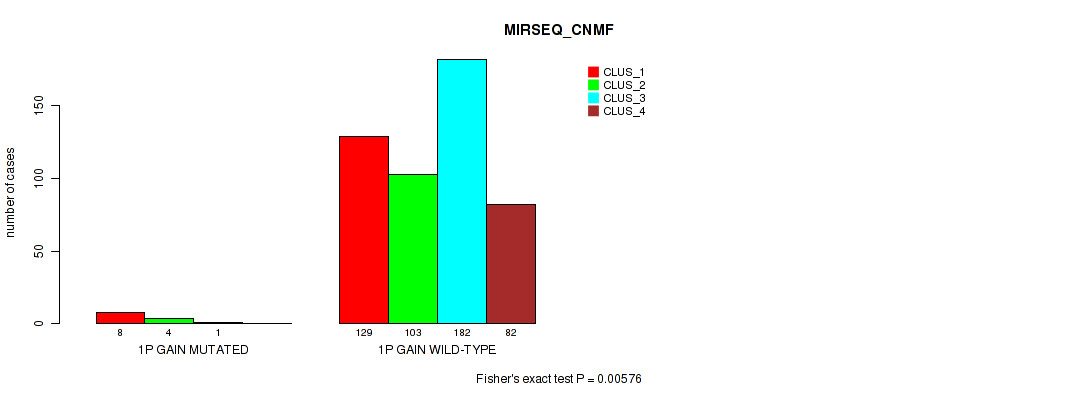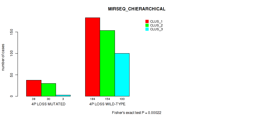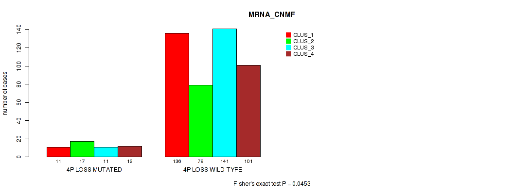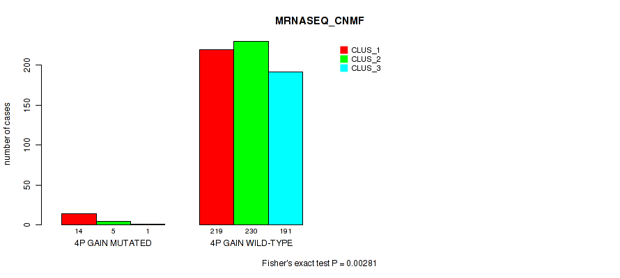 4p gain cnv correlated to 'METHLYATION_CNMF', 'MRNASEQ_CNMF', 'MRNASEQ_CHIERARCHICAL', and 'MIRSEQ_CHIERARCHICAL'.