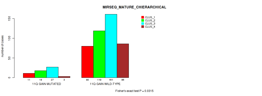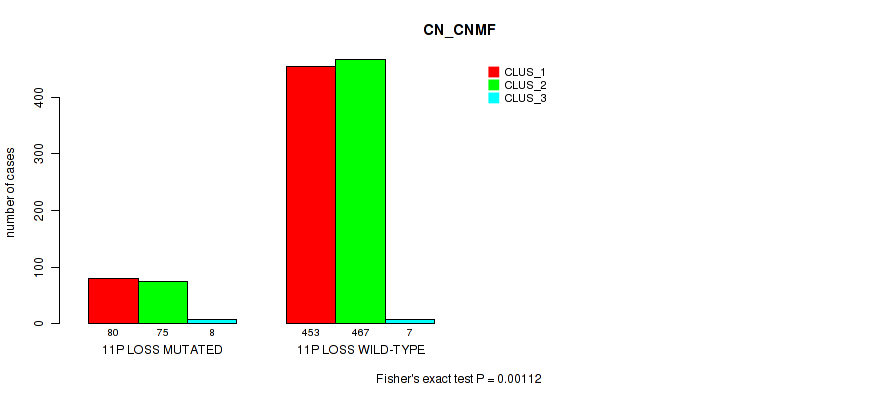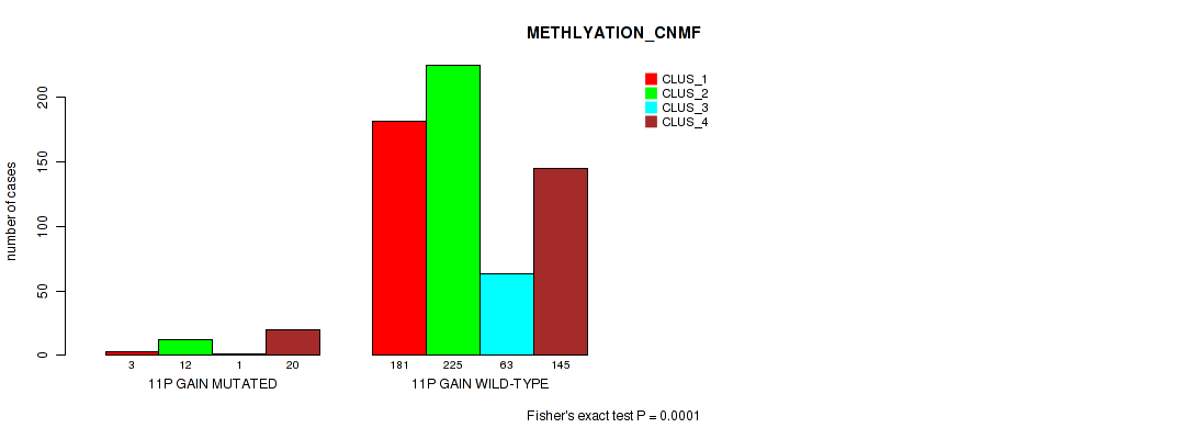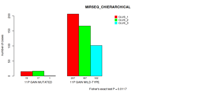 11p gain cnv correlated to 'CN_CNMF', 'METHLYATION_CNMF', 'MRNASEQ_CHIERARCHICAL', 'MIRSEQ_CHIERARCHICAL', and 'MIRSEQ_MATURE_CHIERARCHICAL'.
