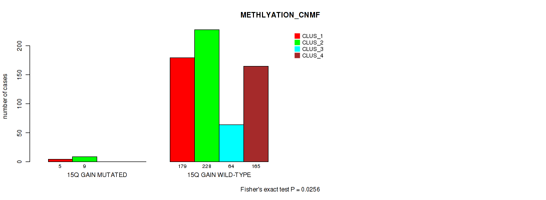 15q gain cnv correlated to 'METHLYATION_CNMF', 'MRNASEQ_CNMF', and 'MRNASEQ_CHIERARCHICAL'.