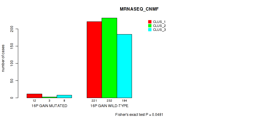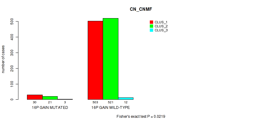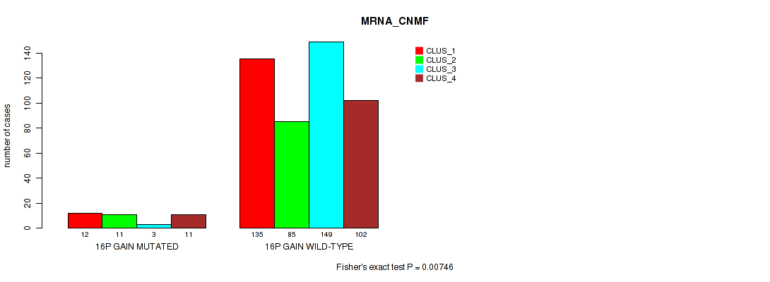 16p gain cnv correlated to 'MRNA_CNMF', 'CN_CNMF', 'MRNASEQ_CNMF', and 'MIRSEQ_CHIERARCHICAL'.
