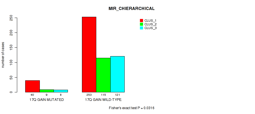 17q gain cnv correlated to 'MRNA_CNMF', 'MRNA_CHIERARCHICAL', 'MIR_CHIERARCHICAL', 'CN_CNMF', 'MRNASEQ_CNMF', 'MRNASEQ_CHIERARCHICAL', and 'MIRSEQ_CNMF'.