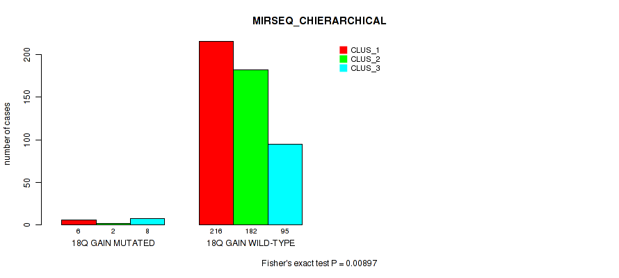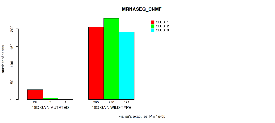 18q gain cnv correlated to 'MRNA_CNMF', 'MRNA_CHIERARCHICAL', 'CN_CNMF', 'METHLYATION_CNMF', 'MRNASEQ_CNMF', 'MRNASEQ_CHIERARCHICAL', 'MIRSEQ_CHIERARCHICAL', and 'MIRSEQ_MATURE_CHIERARCHICAL'.