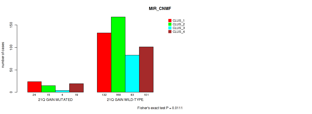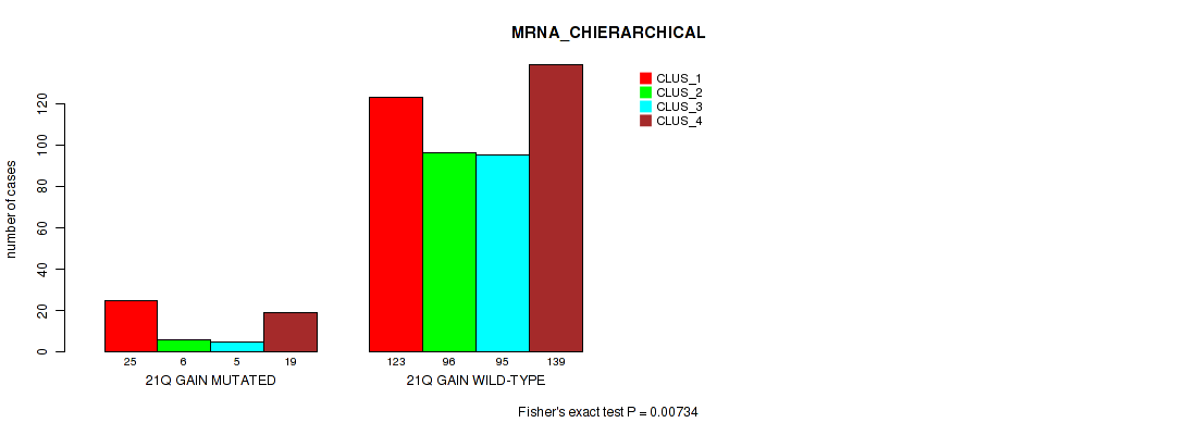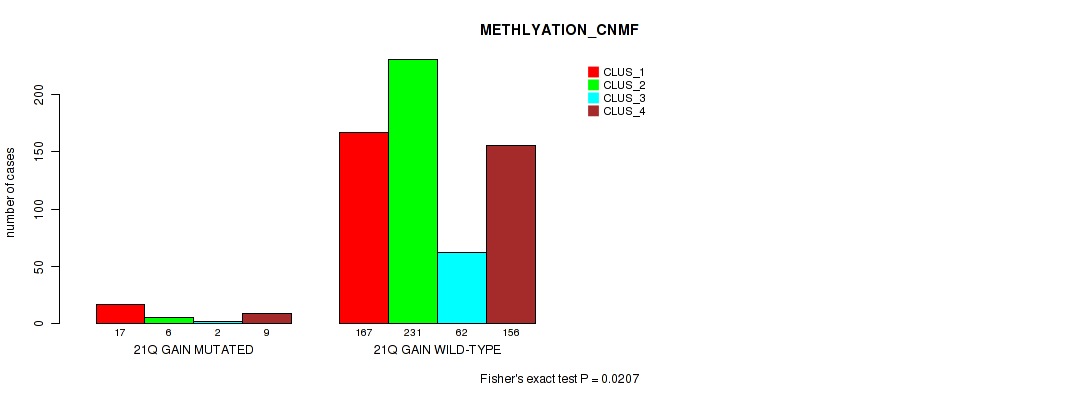 21q gain cnv correlated to 'MRNA_CNMF', 'MRNA_CHIERARCHICAL', 'MIR_CNMF', 'MIR_CHIERARCHICAL', 'CN_CNMF', 'METHLYATION_CNMF', 'MRNASEQ_CNMF', and 'MRNASEQ_CHIERARCHICAL'.