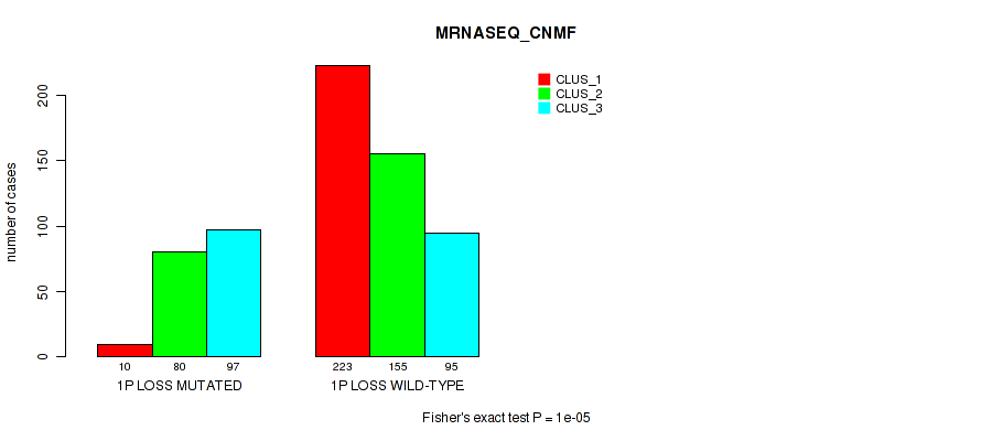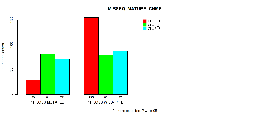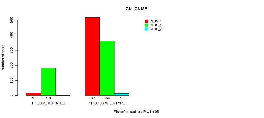 1p loss cnv correlated to 'CN_CNMF', 'METHLYATION_CNMF', 'MRNASEQ_CNMF', 'MRNASEQ_CHIERARCHICAL', 'MIRSEQ_CNMF', 'MIRSEQ_CHIERARCHICAL', 'MIRSEQ_MATURE_CNMF', and 'MIRSEQ_MATURE_CHIERARCHICAL'.