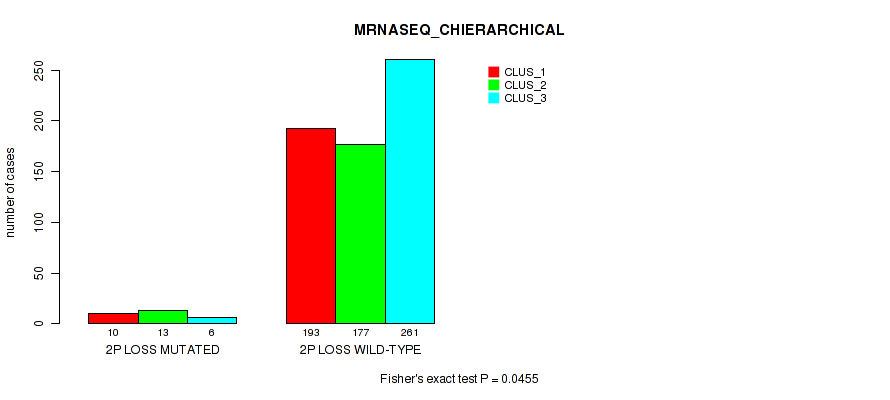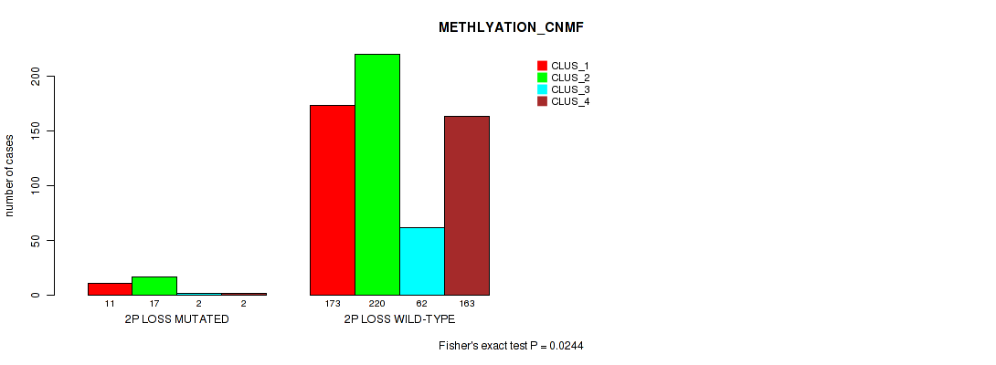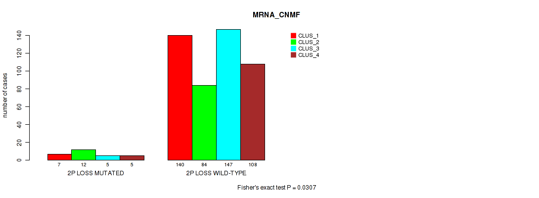 2p loss cnv correlated to 'MRNA_CNMF', 'MRNA_CHIERARCHICAL', 'METHLYATION_CNMF', and 'MRNASEQ_CHIERARCHICAL'.