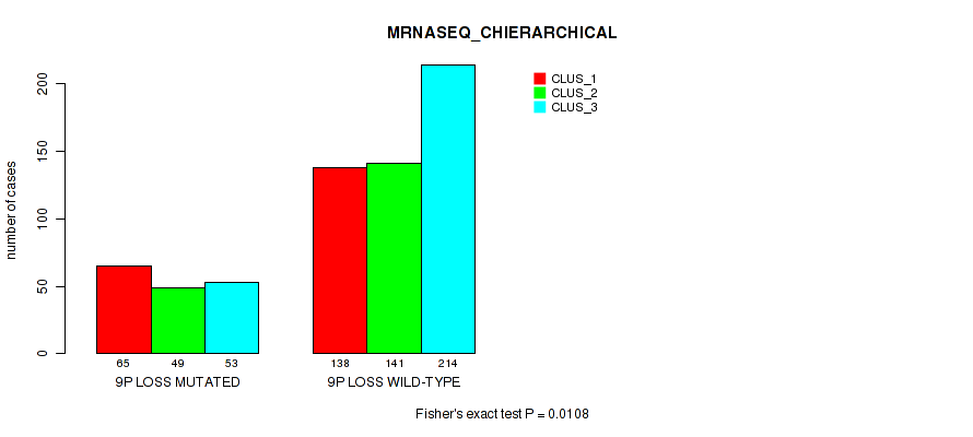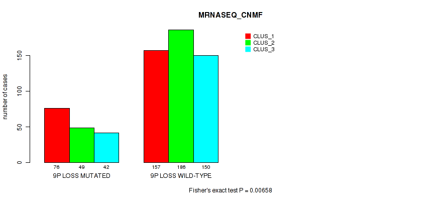 9p loss cnv correlated to 'MRNA_CNMF', 'CN_CNMF', 'METHLYATION_CNMF', 'MRNASEQ_CNMF', 'MRNASEQ_CHIERARCHICAL', and 'MIRSEQ_MATURE_CHIERARCHICAL'.